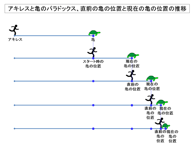 亀に追い付くまでの経過観測を、無限に細分化するのである。数式化するとあっさり追い抜くが。>>936