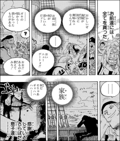 血の繋がりはない息子や娘に囲まれてた白ひげの願いがこれで、血が繋がってる家族に囲まれてたビッグマムの願いが「マザーや羊の家の友達とまた会いたい」でしかないのが悲しい>>924