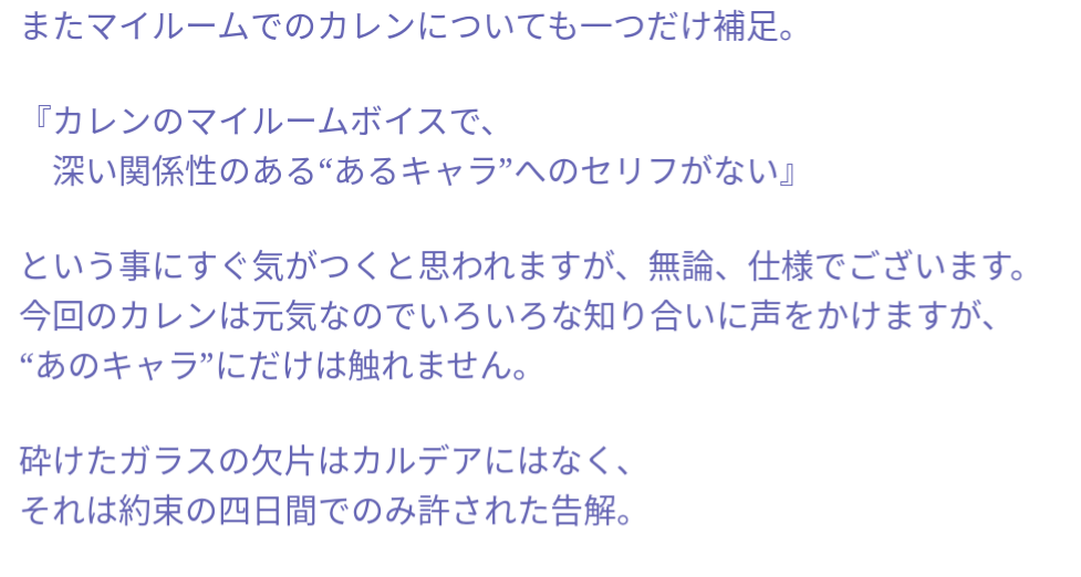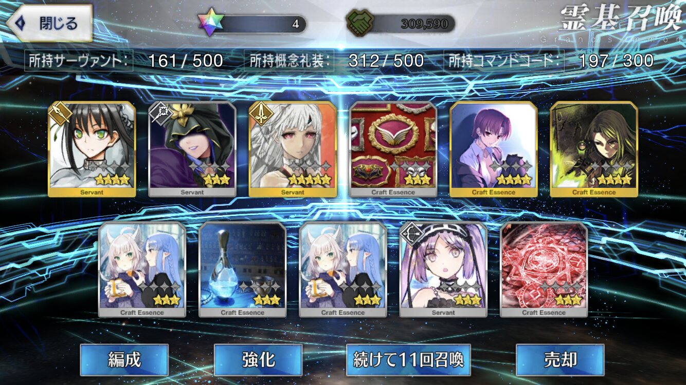 いやー星4礼装4連発はキツイっすわー奈須先生が仰ったいずれ来るらしい昼と夜にわかれたホロウイベは事件簿イベとはまた違う型で一度今までの歩みを見せてそれは後悔を抱える別の誰かが歩いたりしたりロマニ以外の職員型揃っていたりクリプターの皆とワチャわちゃするギャグが挟まっていたり最後の最後はまた熱いバトル悪い見せてくれそうですね