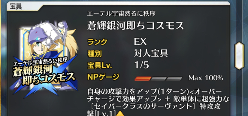 ・剣の全体宝具で最高の威力を持つエクスカリバーは撃った後NP20リチャージ、スキルでNP30チャージと合計NP50チャージできるので連発が容易。周回要素がほとんどのゲームでこれはとてもとても助かる