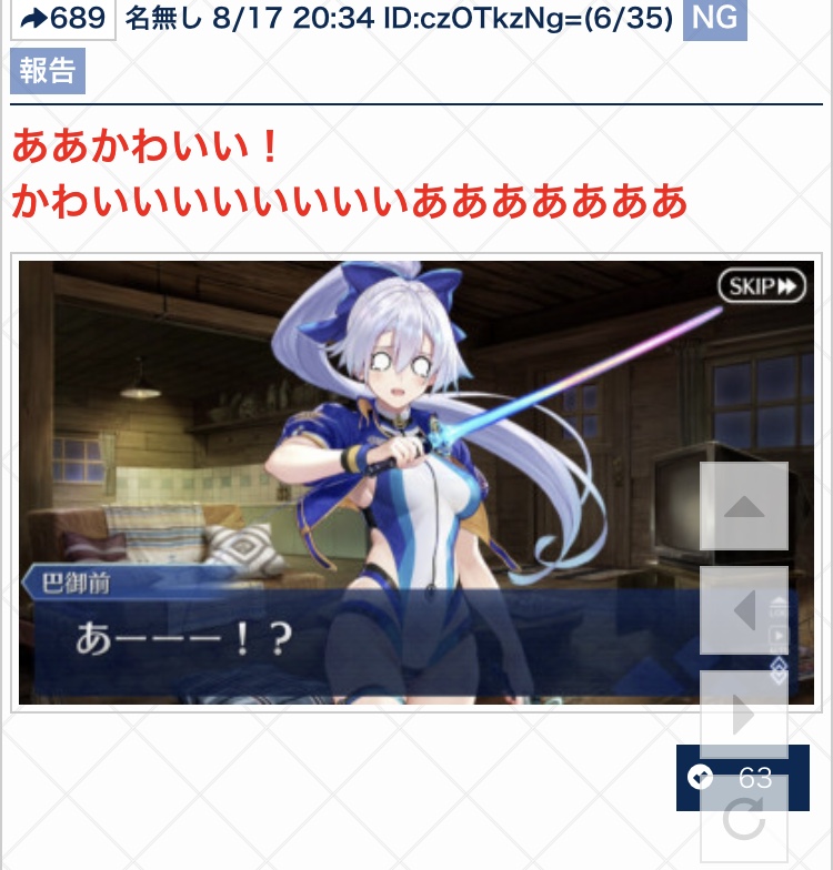 雑談から相談、報告や攻略、盛り上がりたい話題などお気軽に。リーク・解析情報等は禁止です。荒らし・誹謗中傷等は無視し、報告・NGにて対応してください。二次創作画像は転載可能な物に限り、その際必ず引用元を併記してください。R18関連話題、よくてよ無しのガチャ結果、実装から二週間以内のシナリオ及び最終再臨や霊衣解放の画像や話題は専用スレにてお願いします。