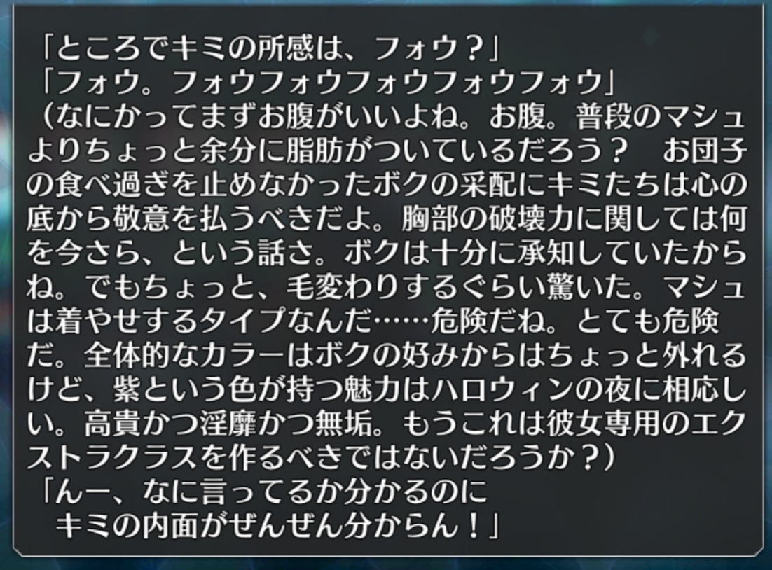 まあ大体のプレイヤーは地道に戦う事を選んだ結果、バフを剥がされるハメになるので苦労するのだが(オルタニキの矢避けを剥がされて強みを奪われた苦い思い出)ふへへ……今年もマシュのチョコ保存せずに食べちゃった……ごちそうさま……
