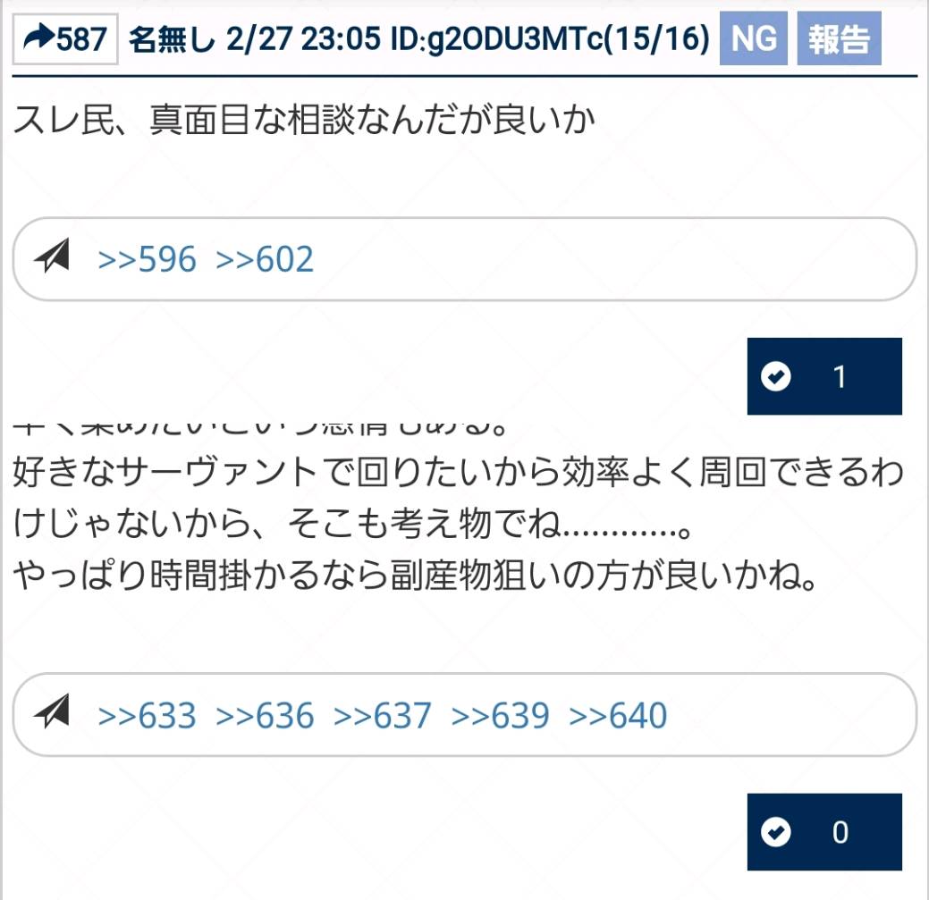雑談から相談、報告や攻略、盛り上がりたい話題などお気軽に。リーク・解析情報等は禁止です。荒らし・誹謗中傷等は無視し、報告・NGにて対応してください。二次創作画像は転載可能な物に限り、その際必ず引用元を併記してください。R18関連話題、よくてよ無しのガチャ結果、実装から二週間以内のシナリオ及び最終再臨や霊衣解放の画像や話題は専用スレにてお願いします。