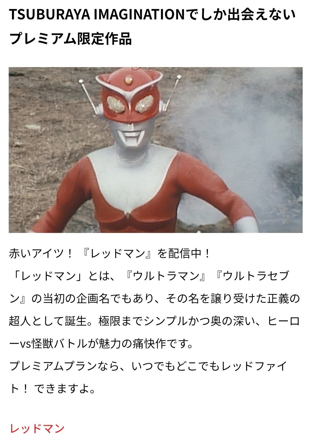 あと意外な事に通常プランでアンドロメロスも観れた、いや普通にウルトラシリーズなんだけど少し意外>>935