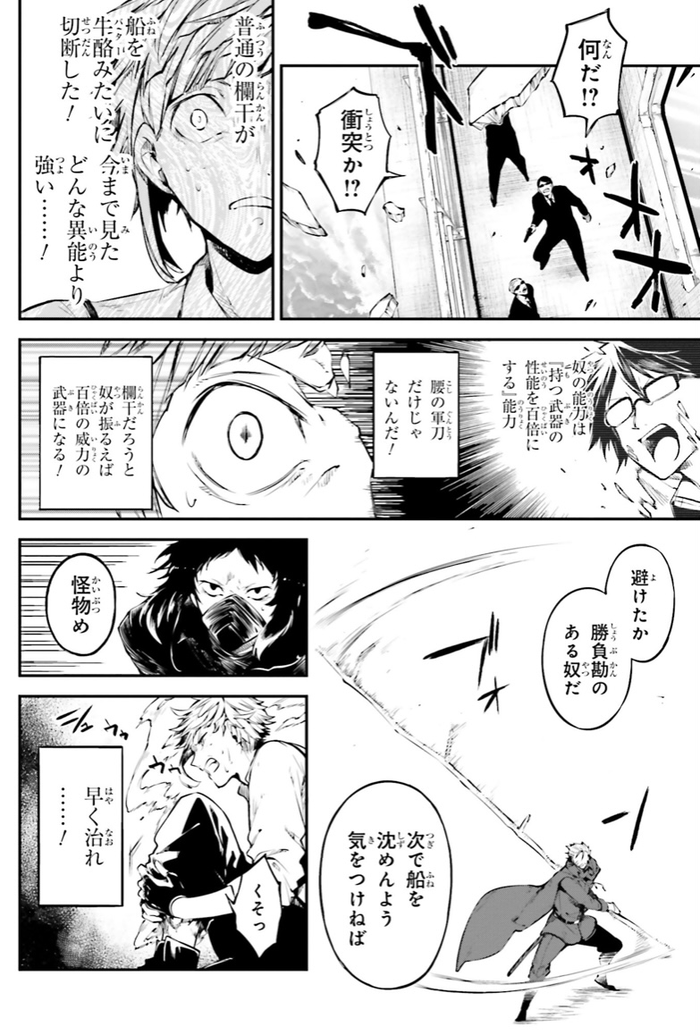 「猟犬」の固有能力である「異能手術による肉体強化」と、自身の異能である武器バフというカラテ力の盛り具合で手つけられねぇんすよ(褒め言葉)、福地殿>>108
