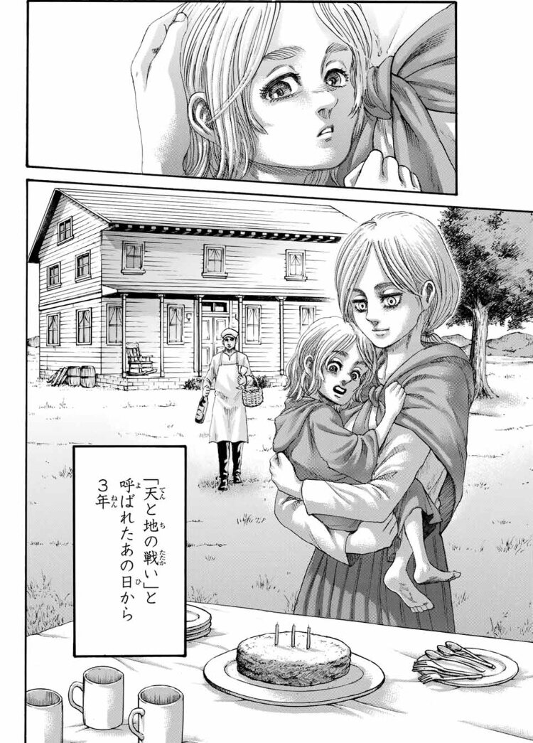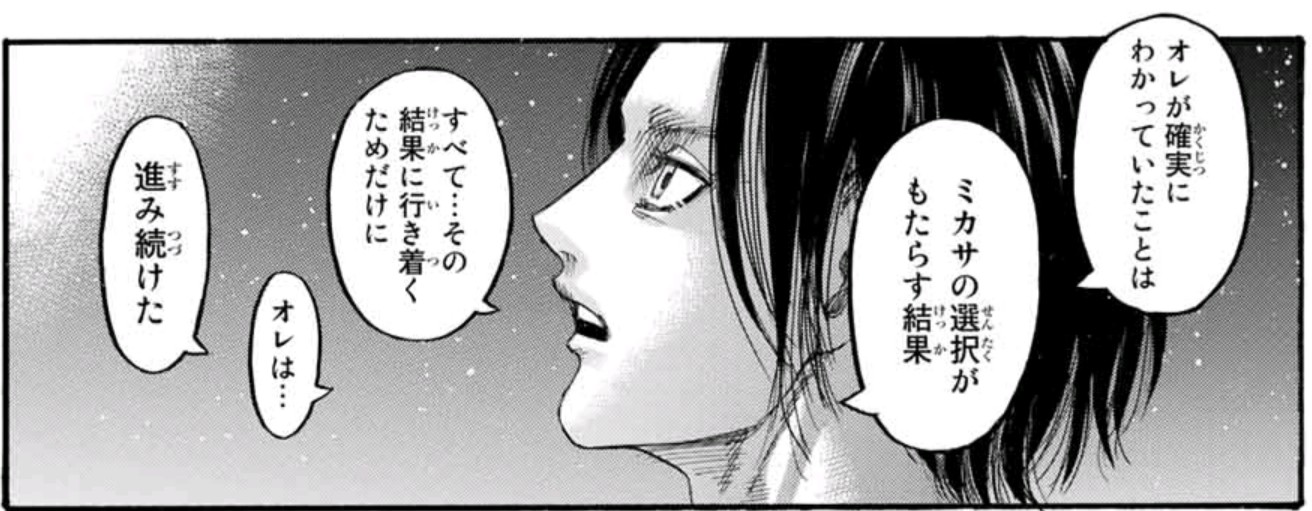 巨人の力という最大の歪みの根源が消えた以上、あの世界の人類は今後人間の力だけで真っ当に歴史を積み重ねていくのだろう。戦争も起こるし、ひょっとしたらアルミン達の和平交渉が何もかも無駄に終わるかもしれなくても