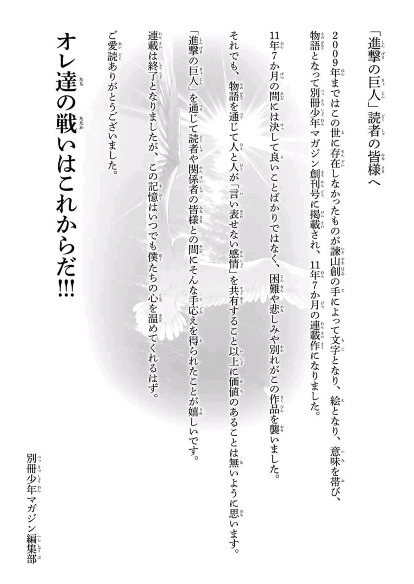 ハッピー、と言っていいのか微妙な所だけど、とにかく大団円を迎えられてよかった進撃…
