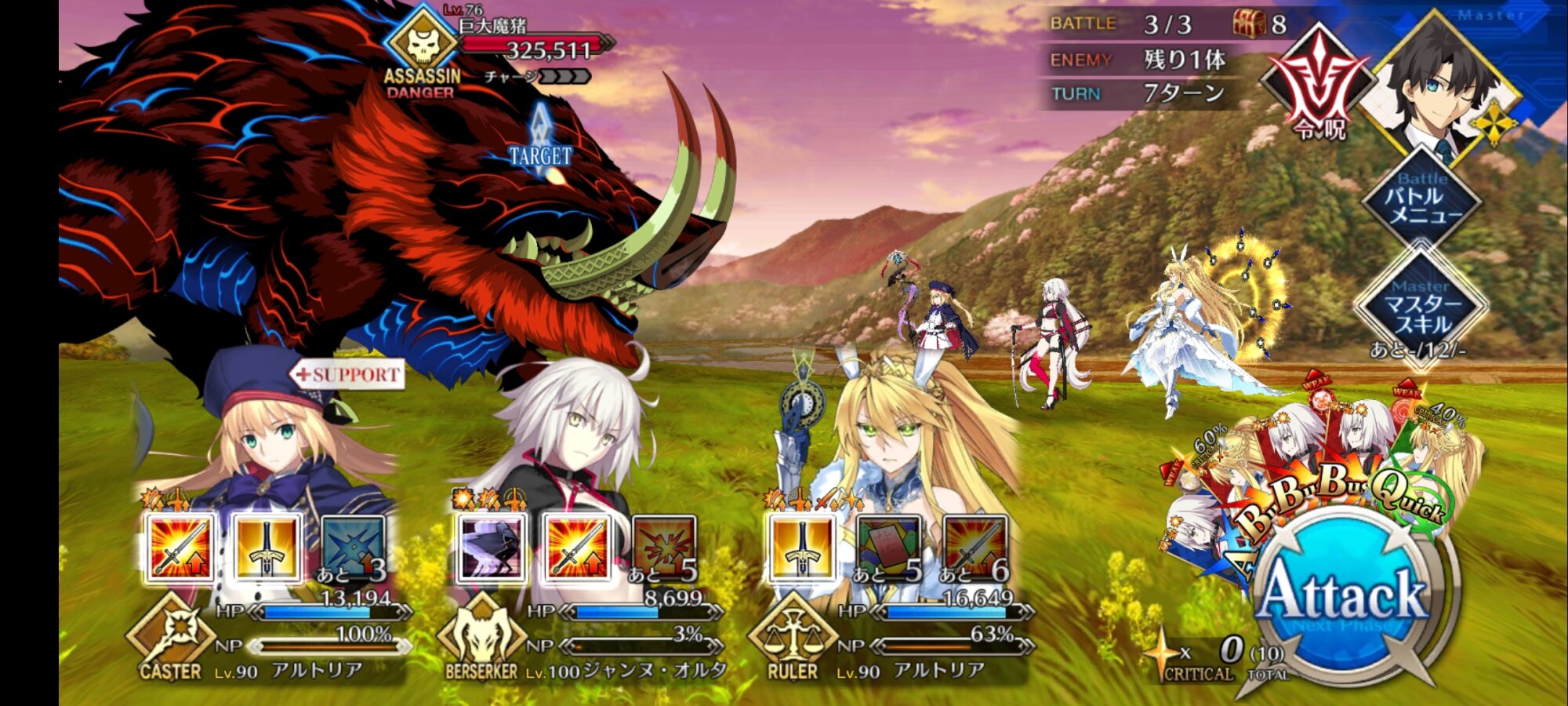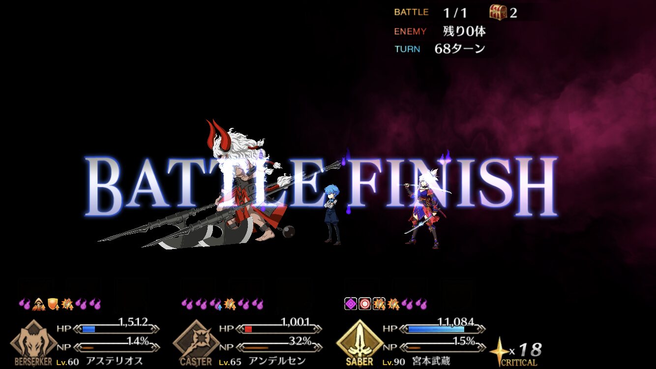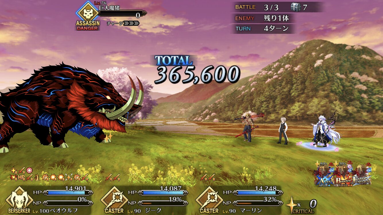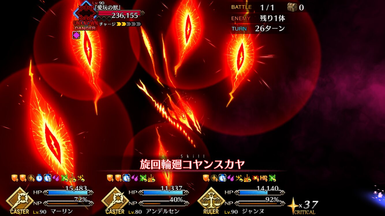 アタッカーにしようとした一ちゃんがそうそうに落ちてキャストリア、孔明、玉藻の三人で永遠宝具回してた