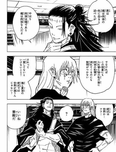 「俺の術式と夏油の術式では世界が違う」って言ってるあたり、羂索の術式理解的には真人復活の芽を摘んだけど、術式の違いが盲点になってたりして>>984