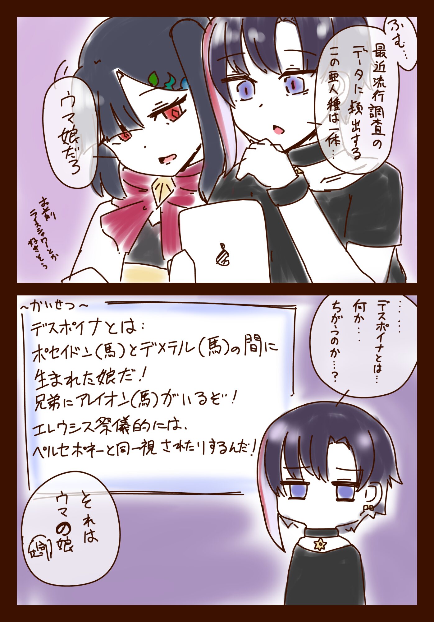 「殺されても仕方ないかなとは思っているが、望んで殺されようとは思わないね。俺はあの時異端であると排他される運命にあったローマの神々をそれでも愛し抜きたかったんだから。いつの世も宗教の正しさで世界を喰い合うのが人間の愚かしさなら、あの頃の俺も彼らもその軛から逃れられなかったということだよ」1000じゃなくても性癖聖杯戦争の自作三人娘描く
