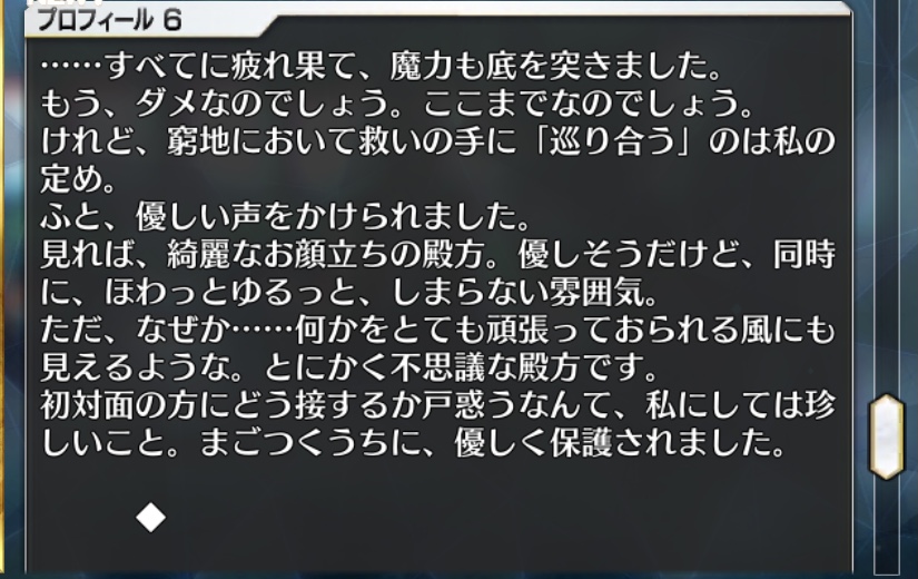 その辺は鶴さんのプロフィールだと恩返し第一主義みたいな感じの記述があるからロマニを悪く思わない一部例外的な鯖の一人なんじゃないかなと自分は解釈した。マシュの「持ち歌、いっきまーす!><」からの「デン……(荘厳)」ていまは遙か理想の城流れるのギャップすごくてちょっと笑う