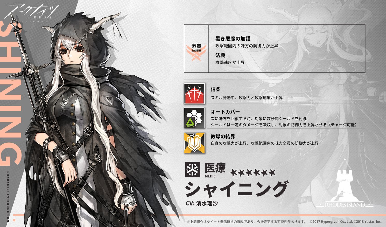 ベアトリクスみたいな一時的に仲間になる強キャラ好き元はサルカズ(悪魔)の医療組織『聴罪師』所属であり、現在は感染者支援組織『使徒』に籍を置く。そしてロドス・アイランドへ協力している医療オペレーター・シャイニング