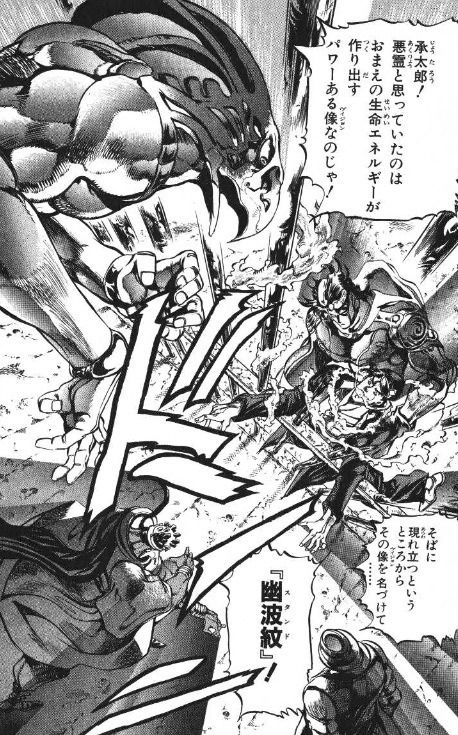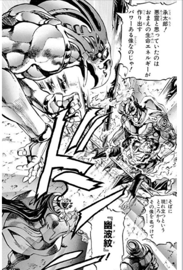 というかそういう目に見えない超能力を(読者の)目に見える形で表現するって発想から来てるのがスタンドでしょ>>24