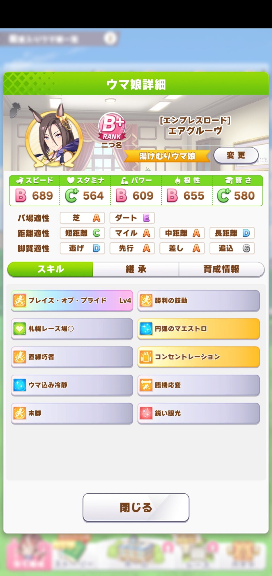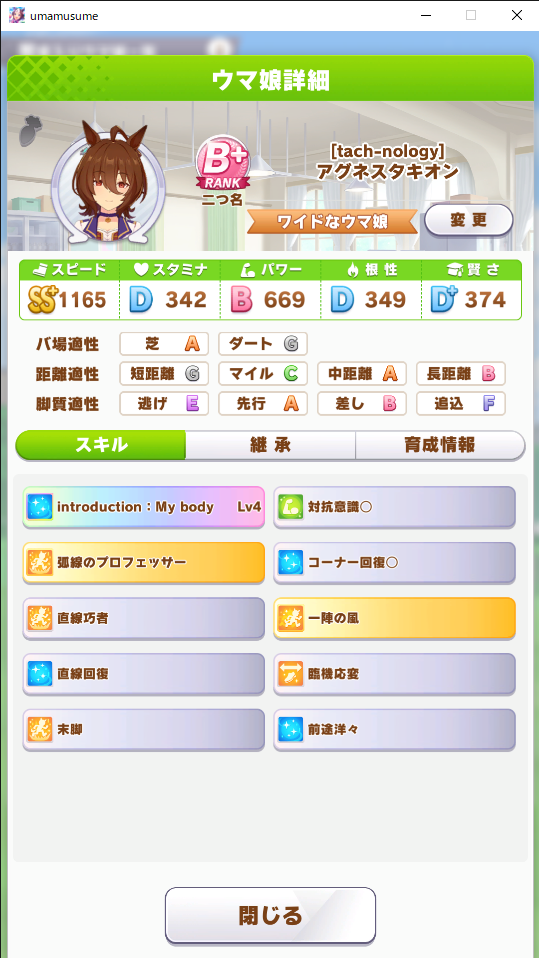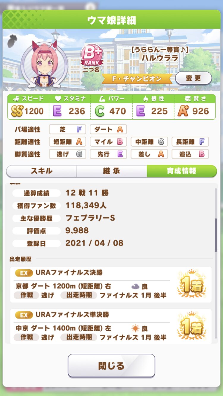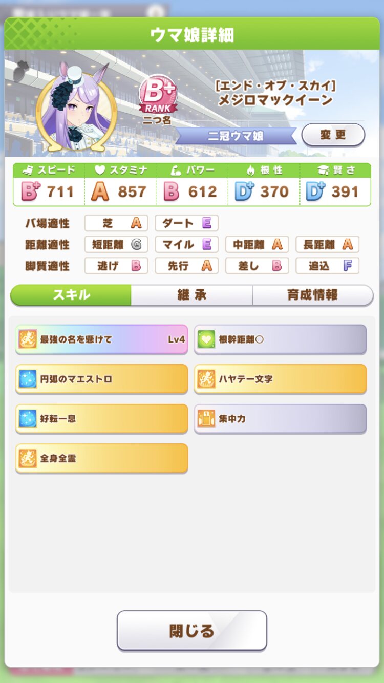 後マックイーンは好位置から抜け出して一気にブッチギっていくタイプだからURAで安定して勝ちたかったらスピードA以上欲しいブライアンクッソ強く育つけどこれリセマラでブライアン引いて始めようとしたトレーナーは最初苦労するだろうなぁ