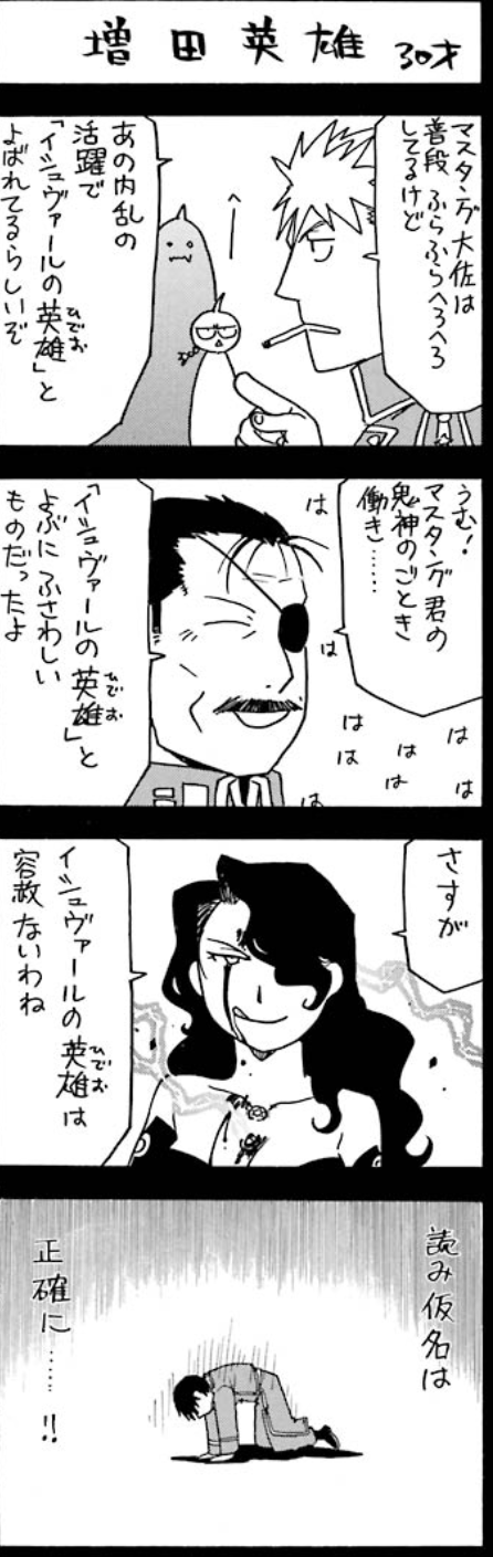 フラスコ(狭い世の中)から出たがる小人、貧乏で多忙な奴隷故に色欲と怠惰と憤怒に無頓着で、傲慢嫉妬強欲暴食へのモチベが高い23号さんの国を巻き込んだ壮大な一人劇と言えなくもないよね、鋼の錬金術師って。>>97