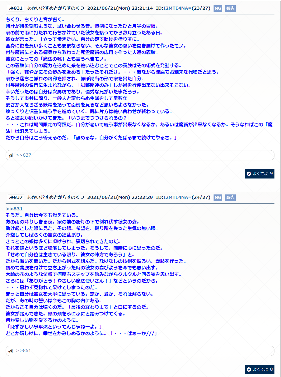 昔は雑談版でお題募ってハーメルンで書いてURL持ってきたりしてたけどダメになってからはやらなくなったな>>961