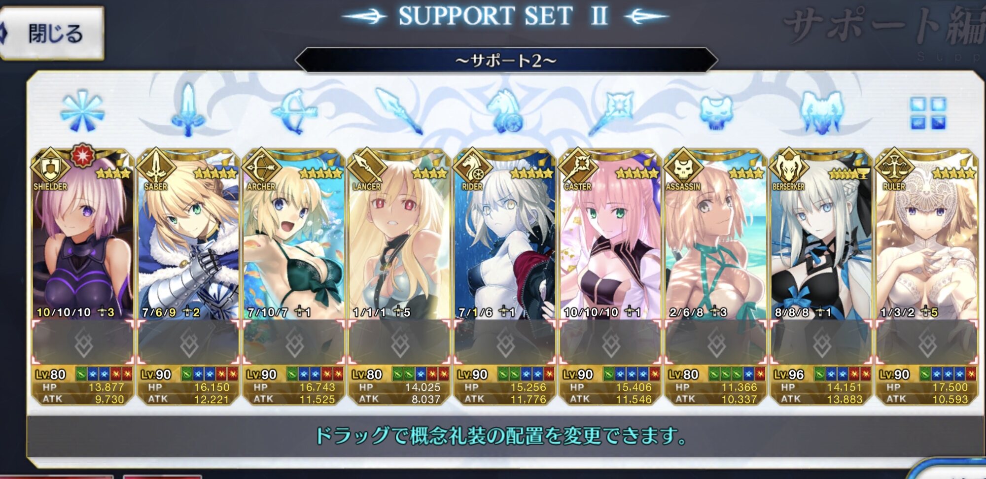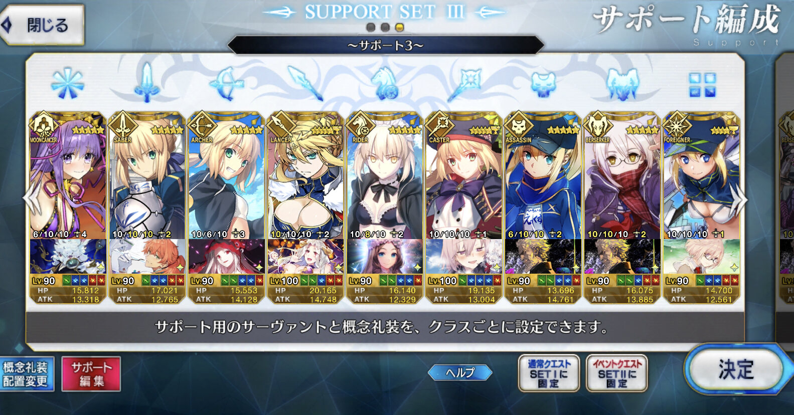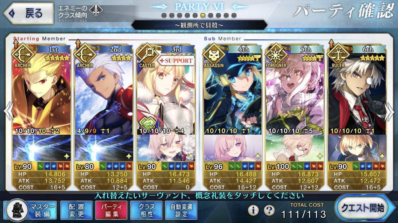 総括すると凸ティー持ちサポ術か絆礼装、イベント限定ものを置いとくのがいい感じですかね?礼装とかどれがいいのかわからないのでとりあえず絆礼装にしといたんですが正解だったみたいで良かったです