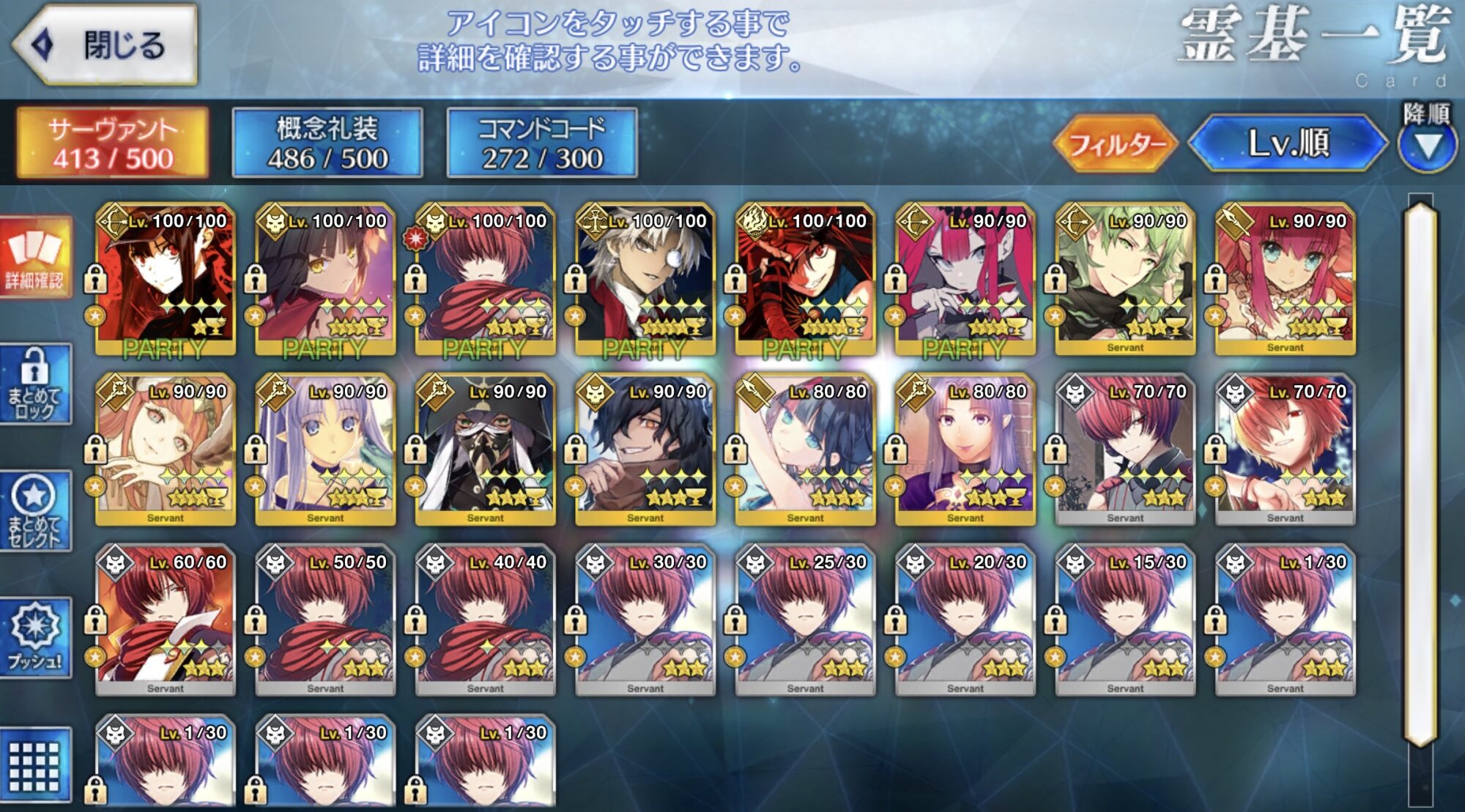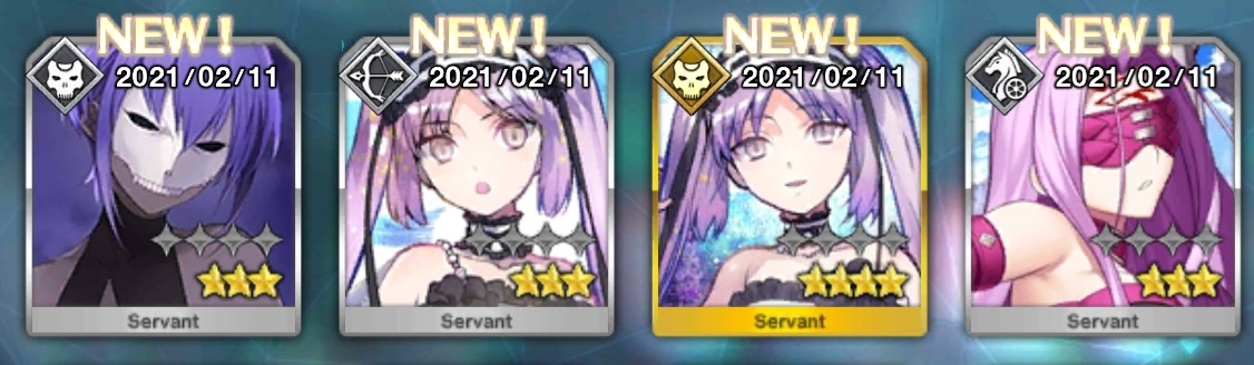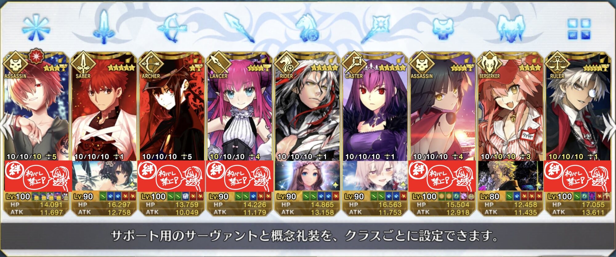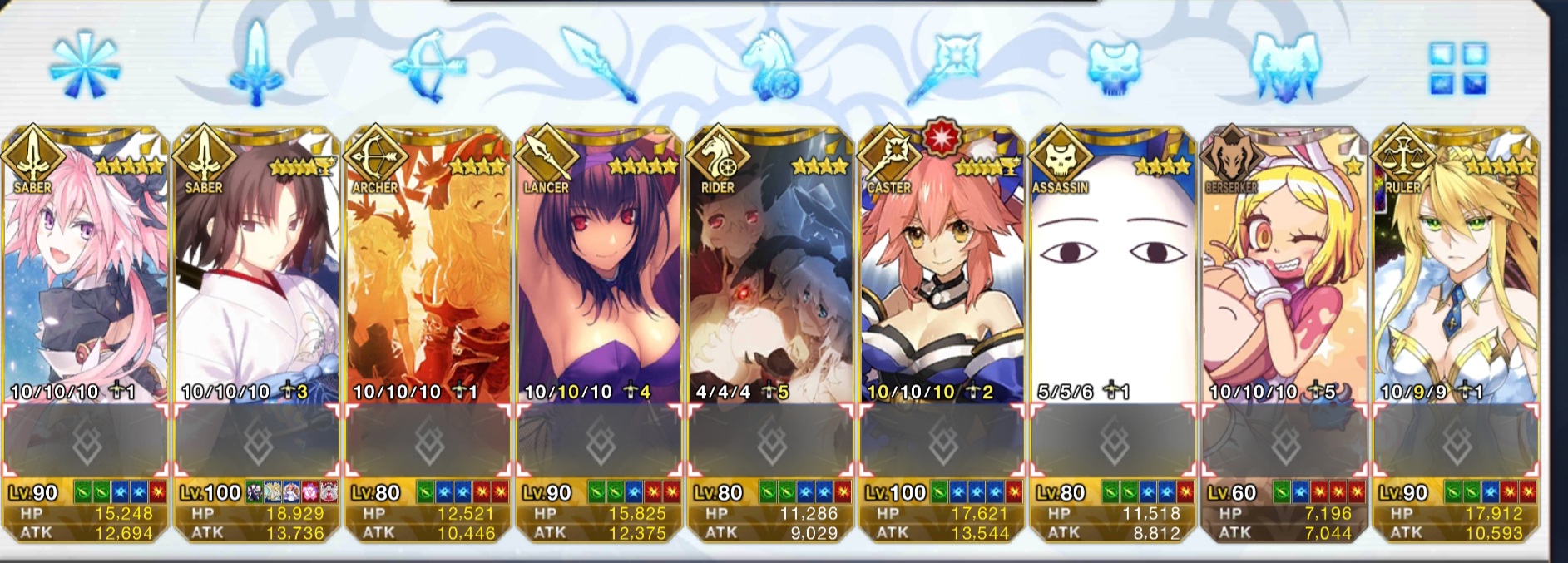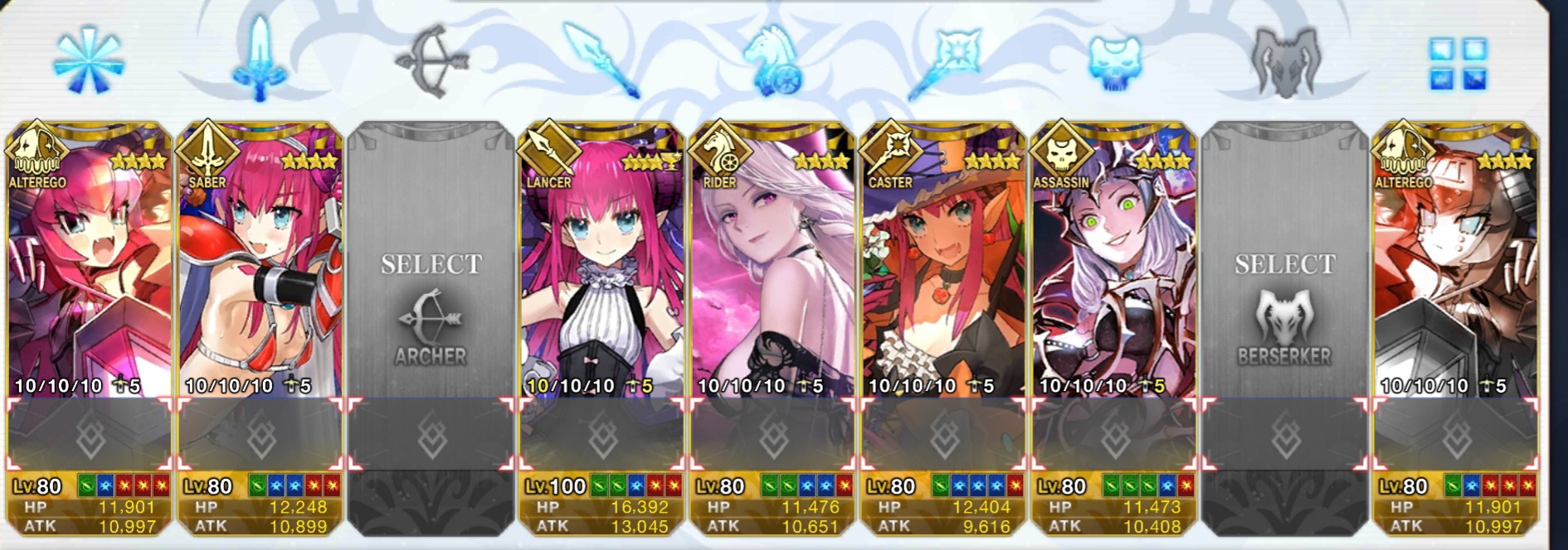まず下の画像をご覧いただきたいんだけど、私の聖杯鯖ってクラスが著しく偏ってて殺三人術四人弓三人EX2人に槍一人(+サ終までに最終巻出たら入れる予定の候補生一人)なわけですよ。