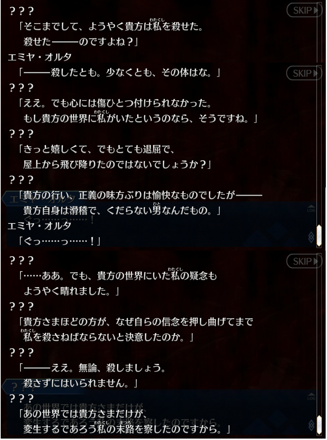 なんていうか、エミヤオルタと言われると甘さや無駄な行動の無い、文字通り機械のような性格のイメージなのよ。軽口を叩く余裕があるとは思って無かったから、ちょっとイメージ違い。
