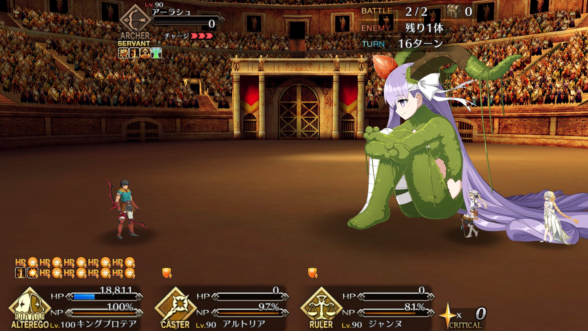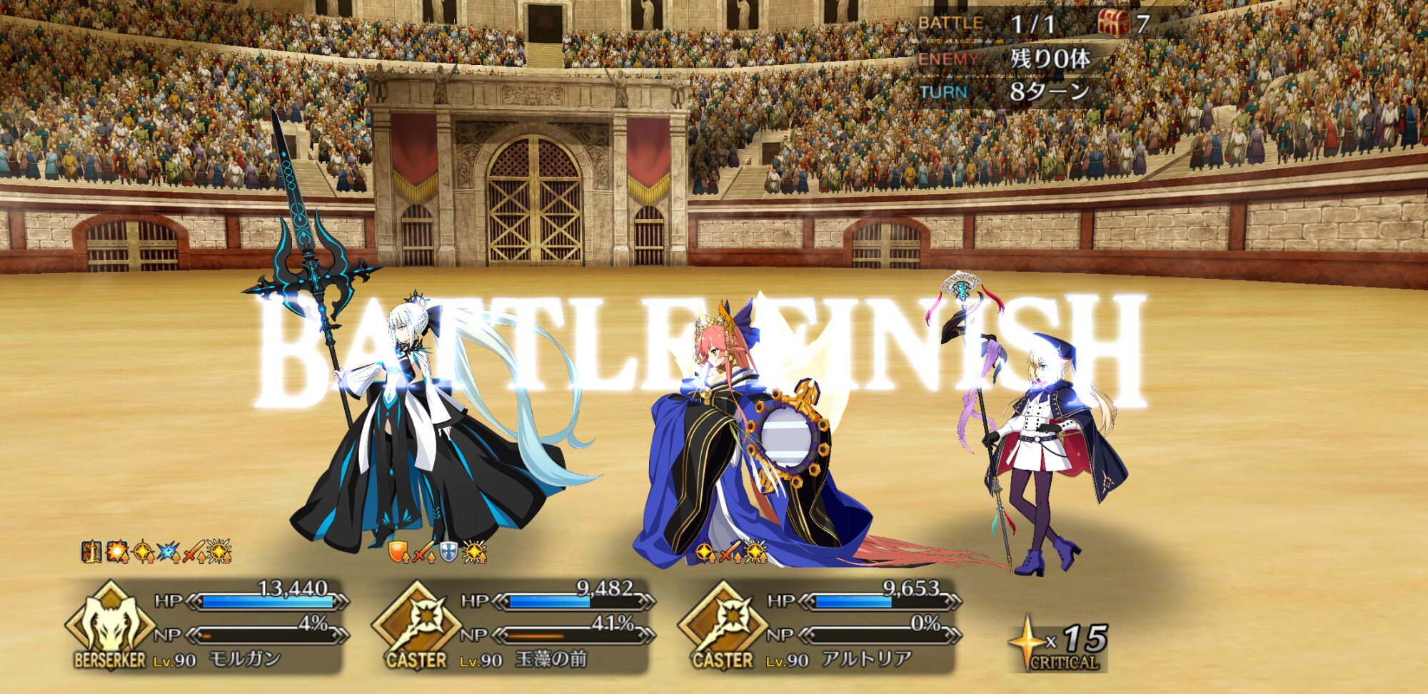 最近は心臓狙いで王者級を回ってます。オデュさんに木馬を発進しまくってもらってますね。オデュさんの戦闘終了ボイスの「ここでは立ち止まらんさ」が好きですね…激戦の後に言ってもらいたい…デメテルもオデュさん&アキレウスで仕留めました。オデュさんいなかったら本当キツかった。1回コンテしてからの前衛全滅、オデュさんとアキレウスだけ残ってるって場面だったんで本当緊張しましたね。強化解除は強い。でも戦闘終了のときアキレウスが「いや〜、お前さんも相当に強かった。縁があったら、また戦おうぜ?」とか言っててリアルに「やめて!」って声が出た記憶。いやでも…今なら頑張れば3ターンいけるかも…?