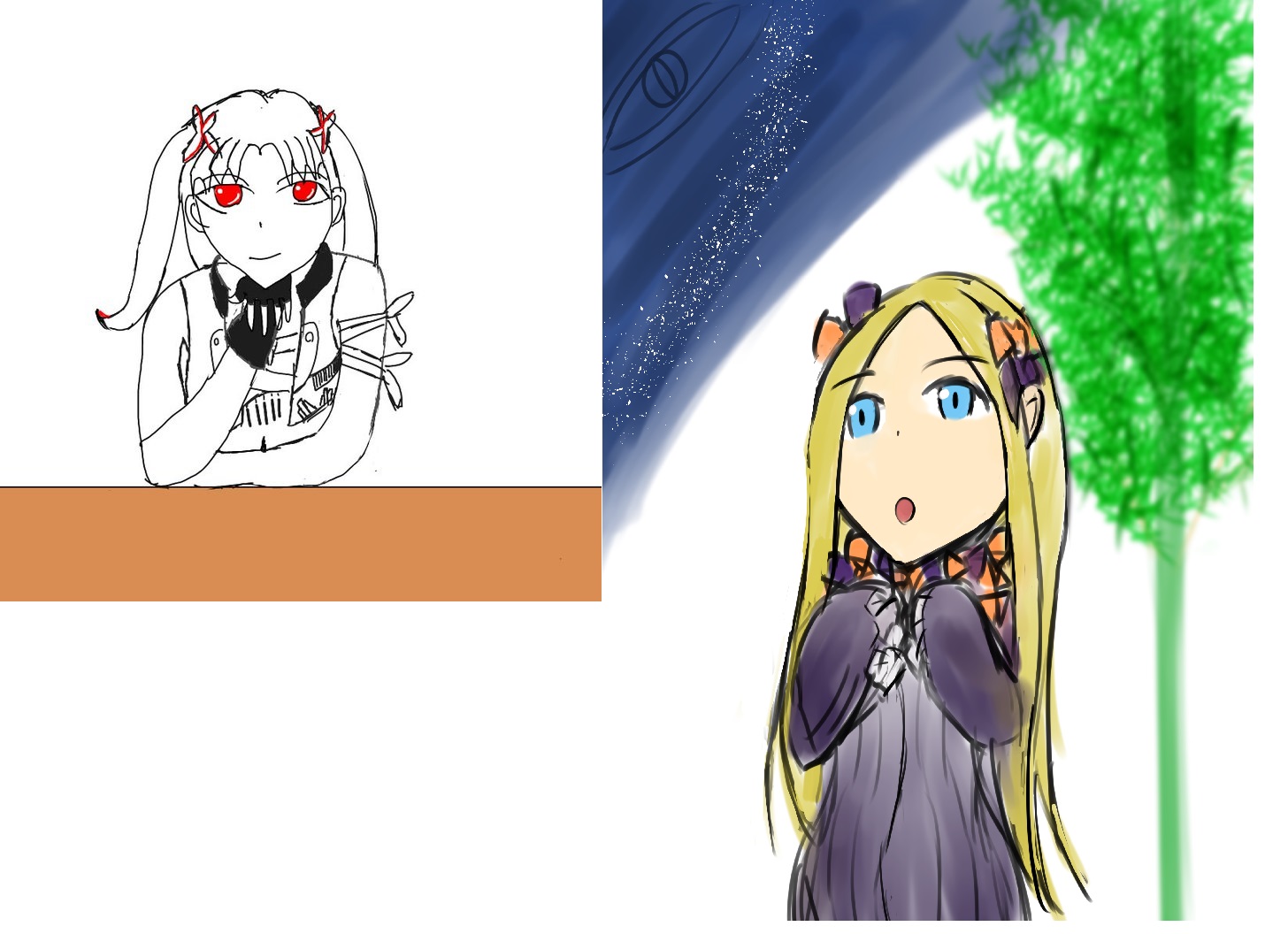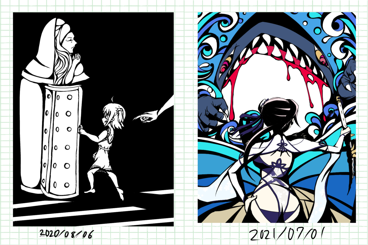 昨日ついでに昔の絵見返してたんですが「これ、まだまだ荒いけど好きだな〜」って過去絵もあって、ここでもらったリクのアイデアはやっぱ秀逸だなとか思いました、リクありがとうございますほんと