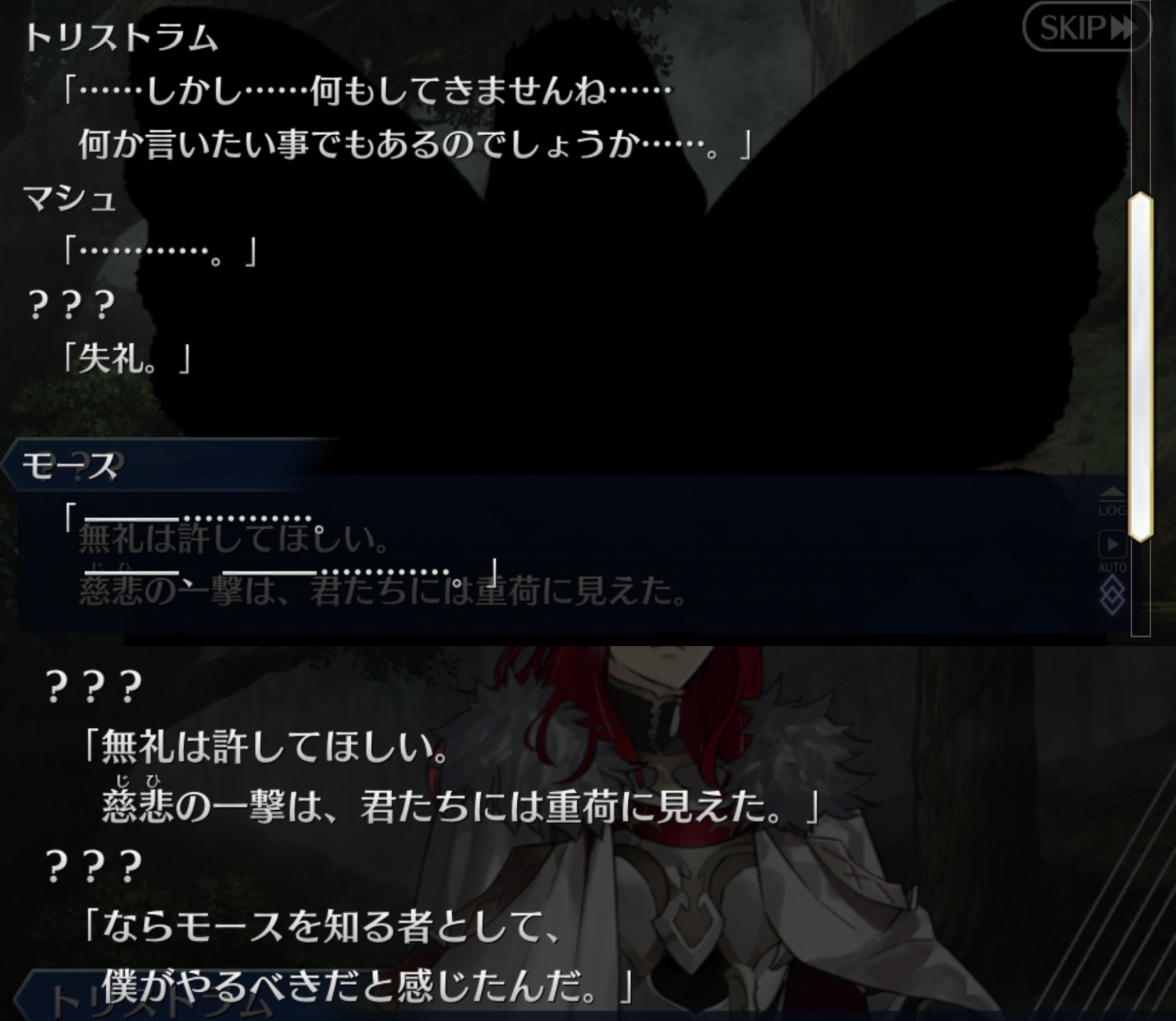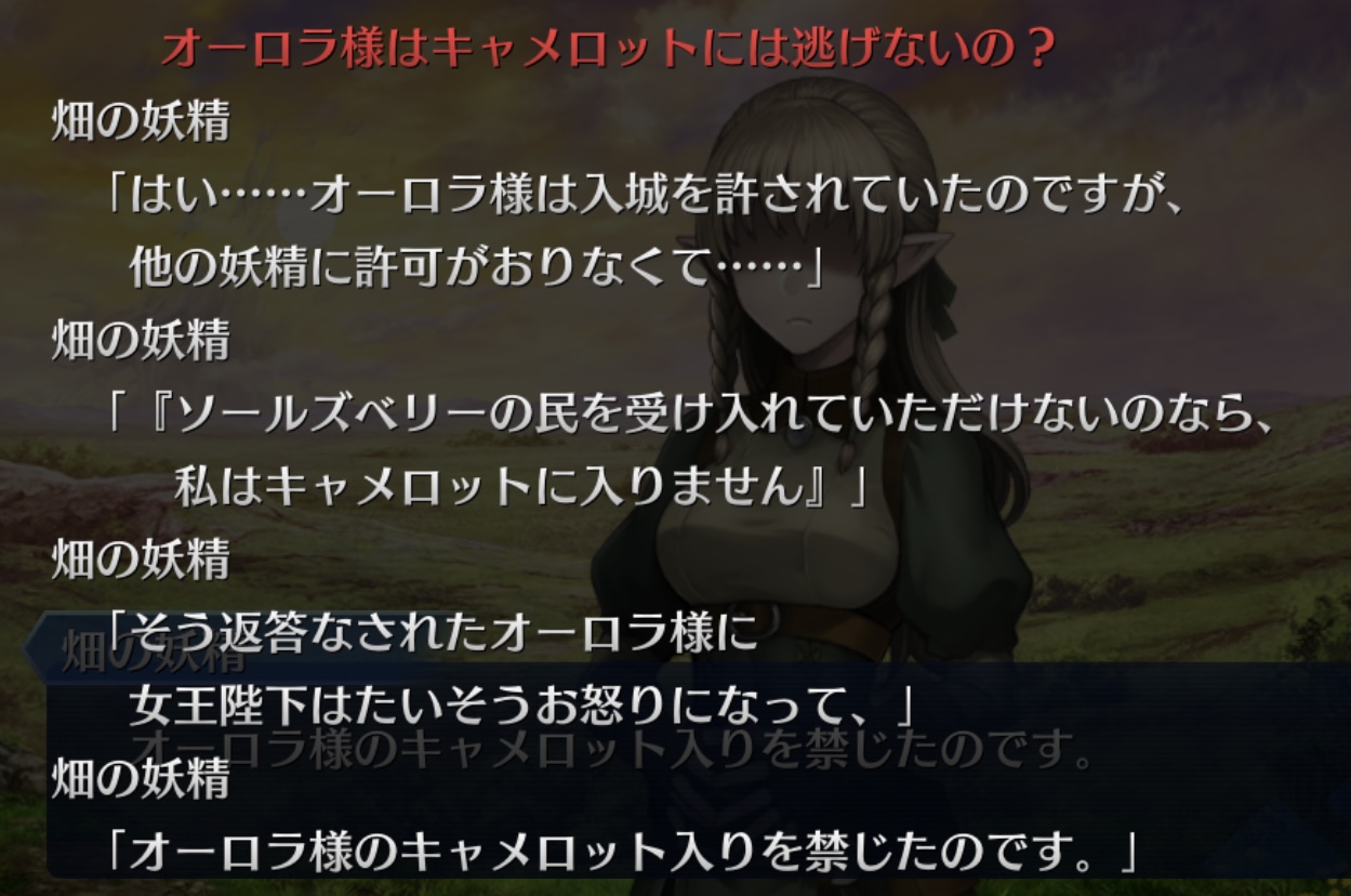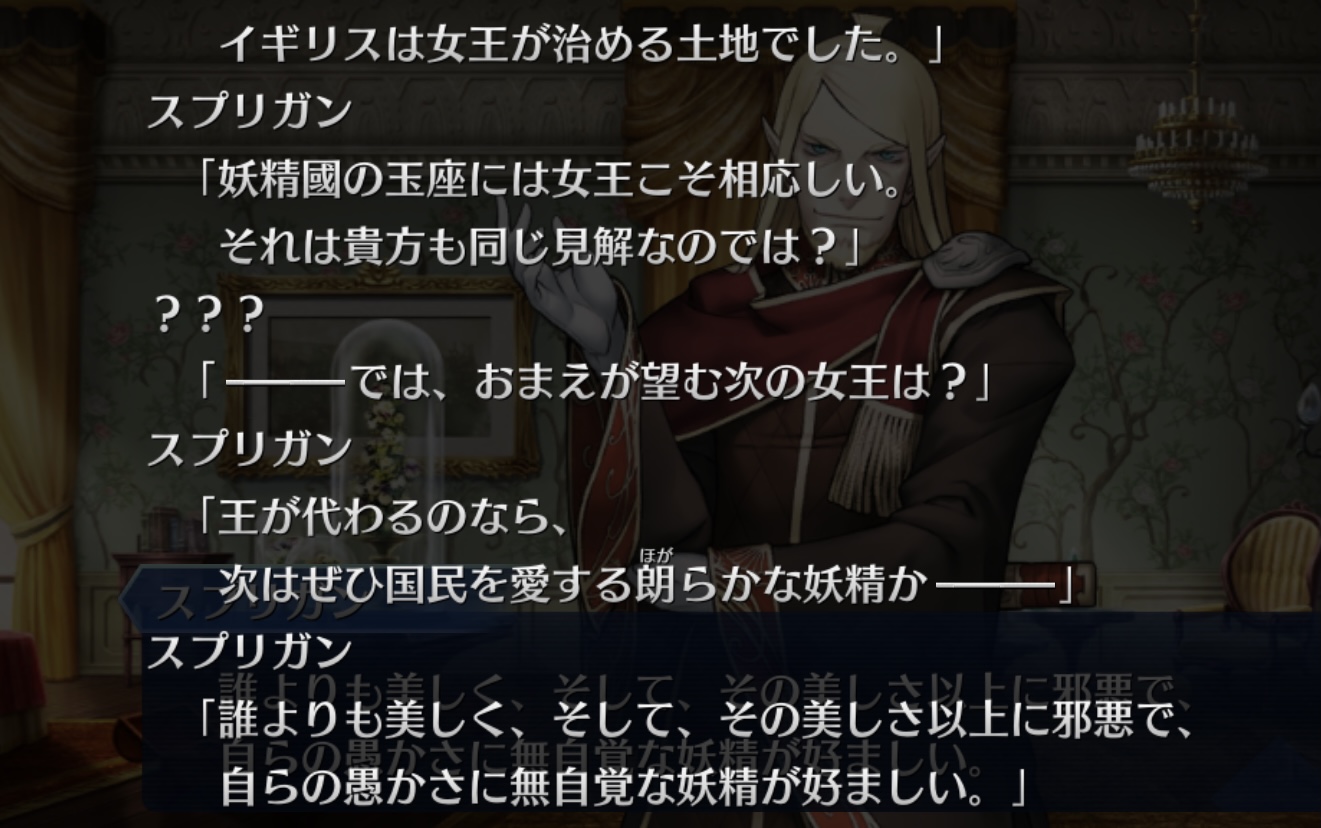 まあ、例えばマシュが戴冠式の記憶の話題を持ち出すとして、正しい歴史には「初代妖精騎士」なんていないって言い返されたら危ないんじゃないかって気もするよね、正しい歴史に存在しない「2400年間眠っていた「初代妖精騎士」を名乗る意味不明な存在」ってなった場合