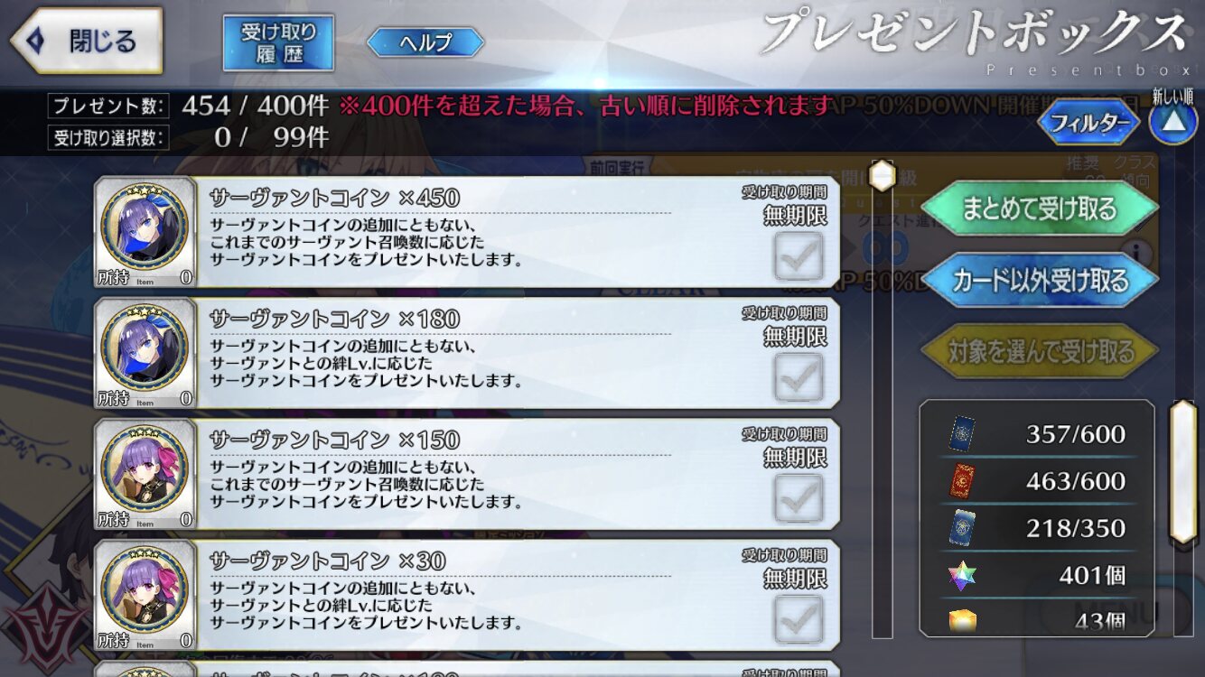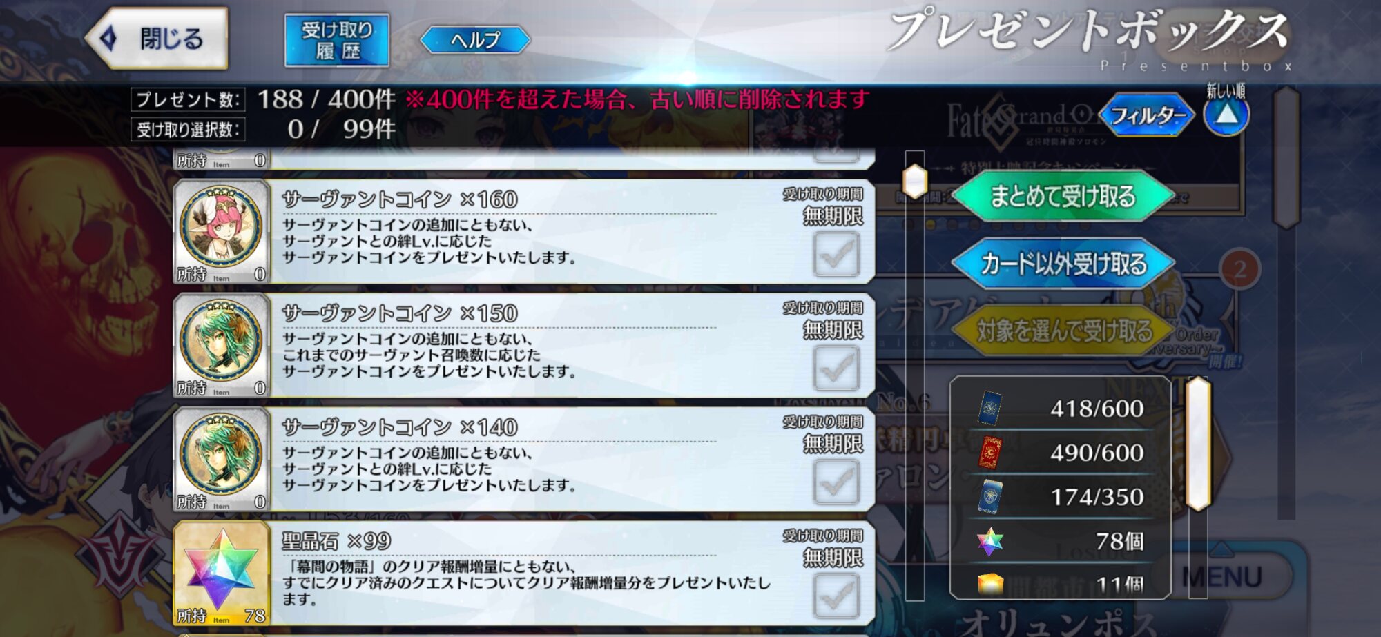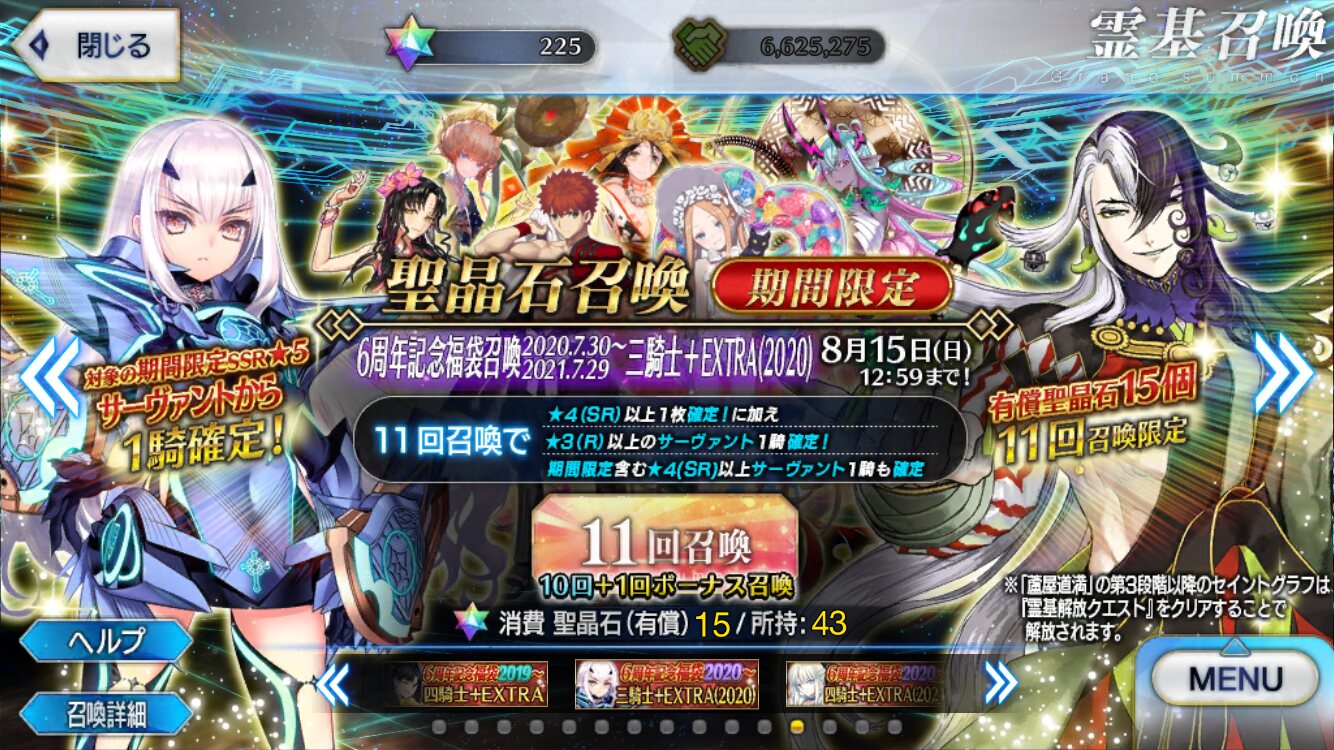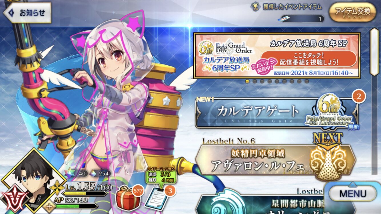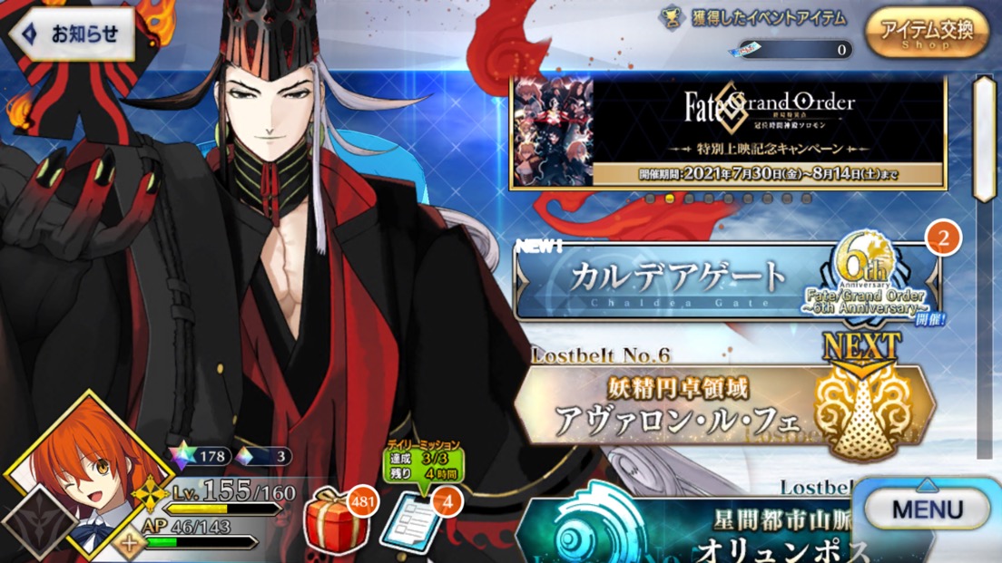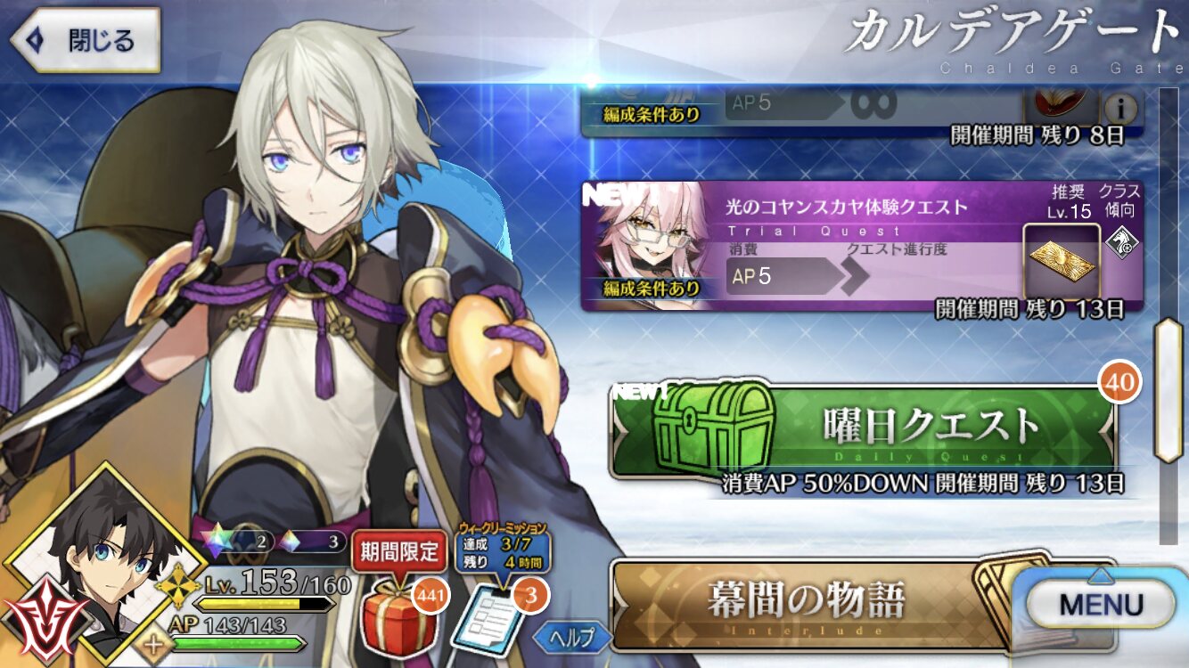 三顧の礼のメリジューヌの人かな?おめでとうございます!そういえばだけど、鯖と礼装の所持数の上限増えたね