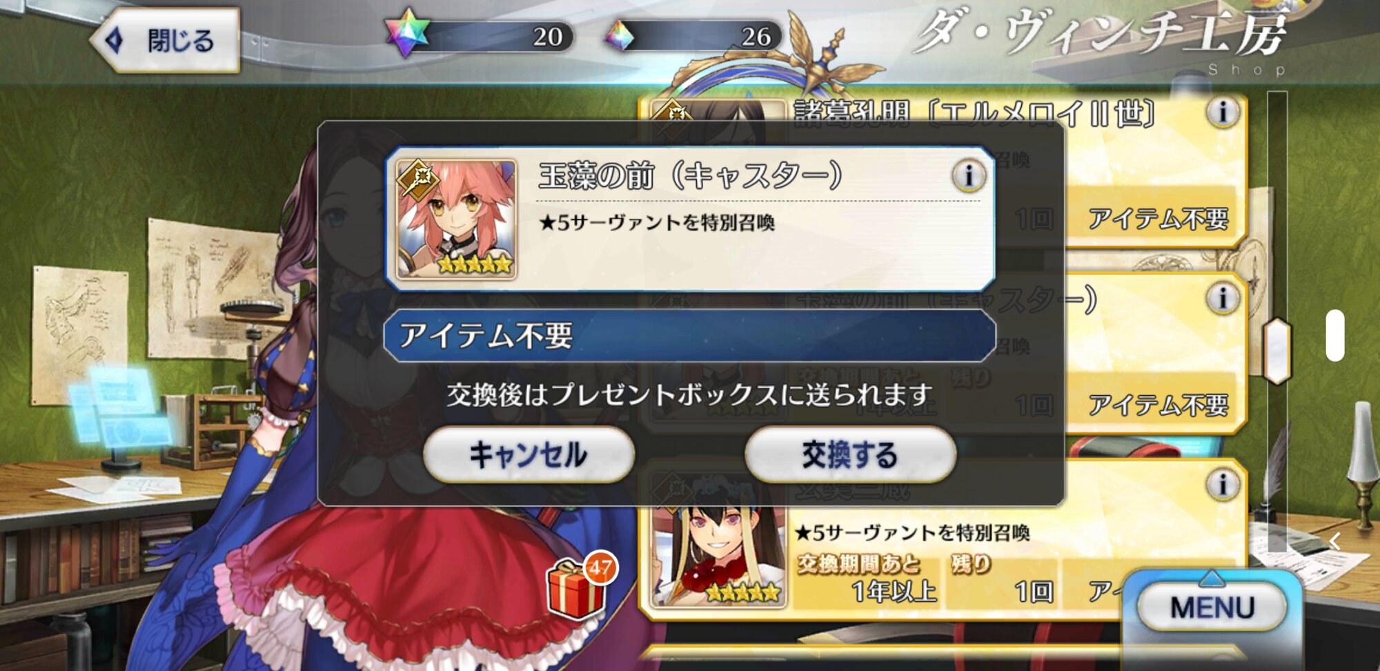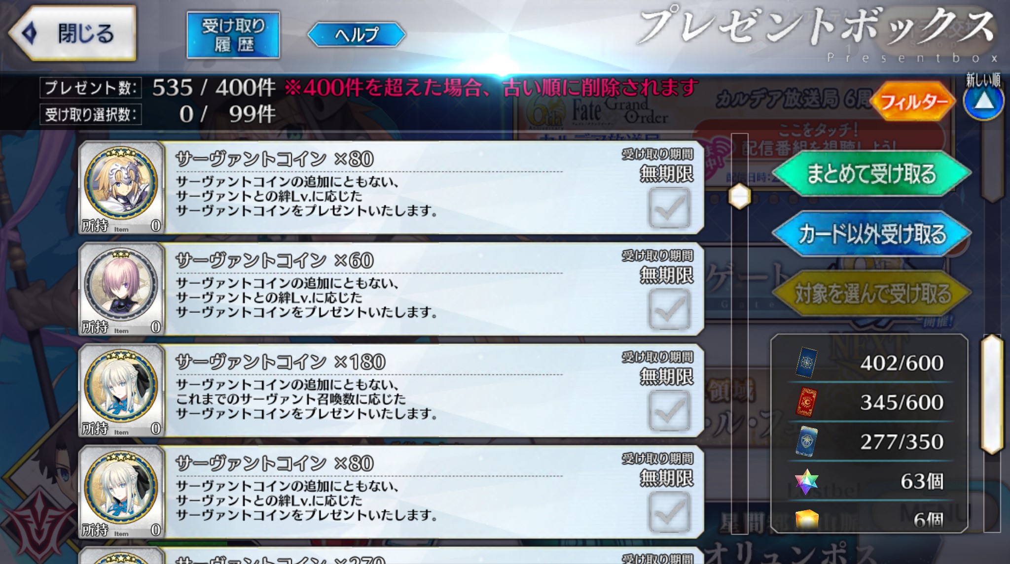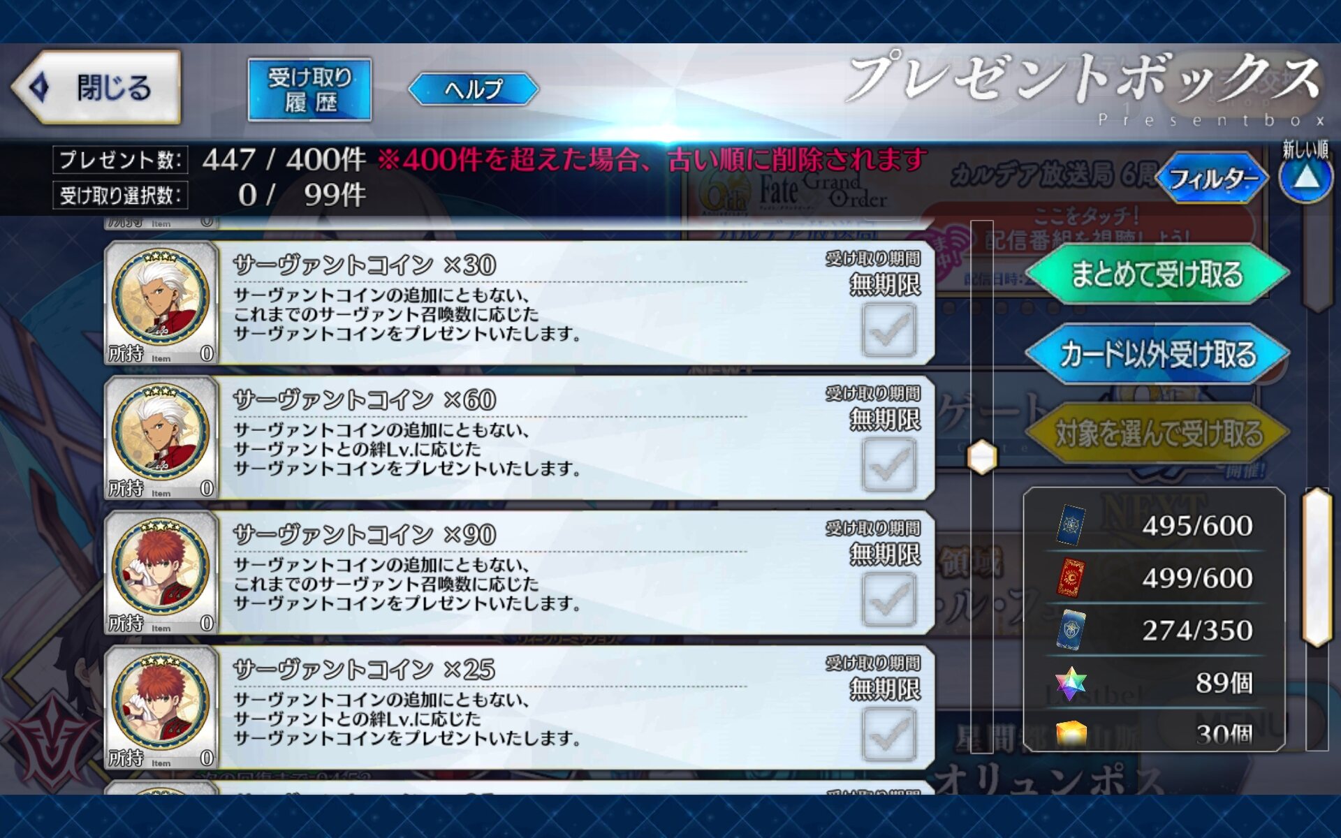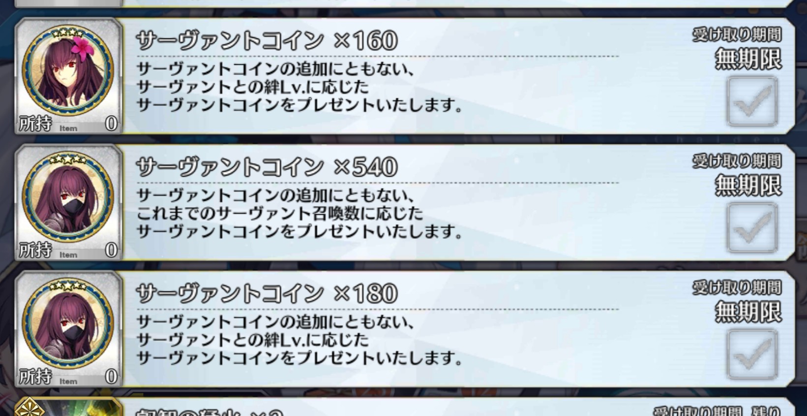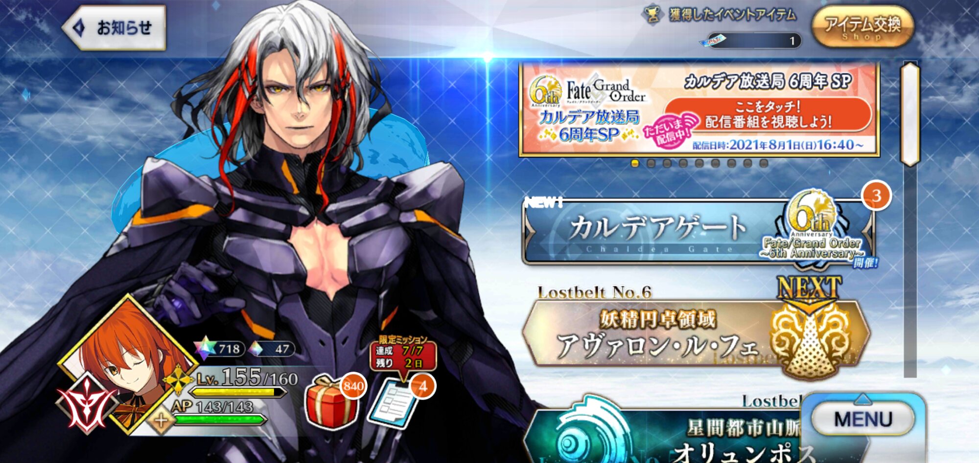 三顧の礼のメリジューヌの人かな?おめでとうございます!そういえばだけど、鯖と礼装の所持数の上限増えたね