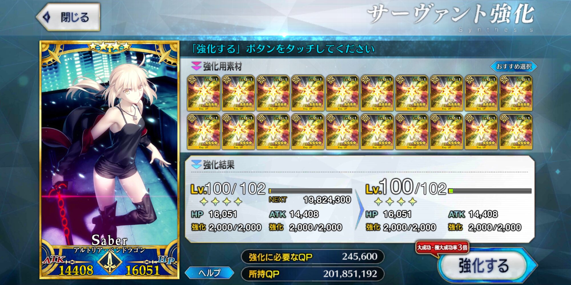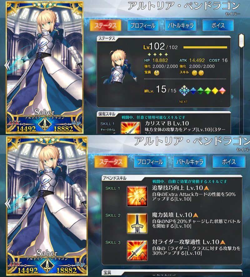 アルトリア(剣)宝具1でカレスコ装備だと道中で等倍8万→12万→13万出せる上確定3連発いける...はず(B付与50%とした)大成功期間を逃さないために種火を回るべきか、