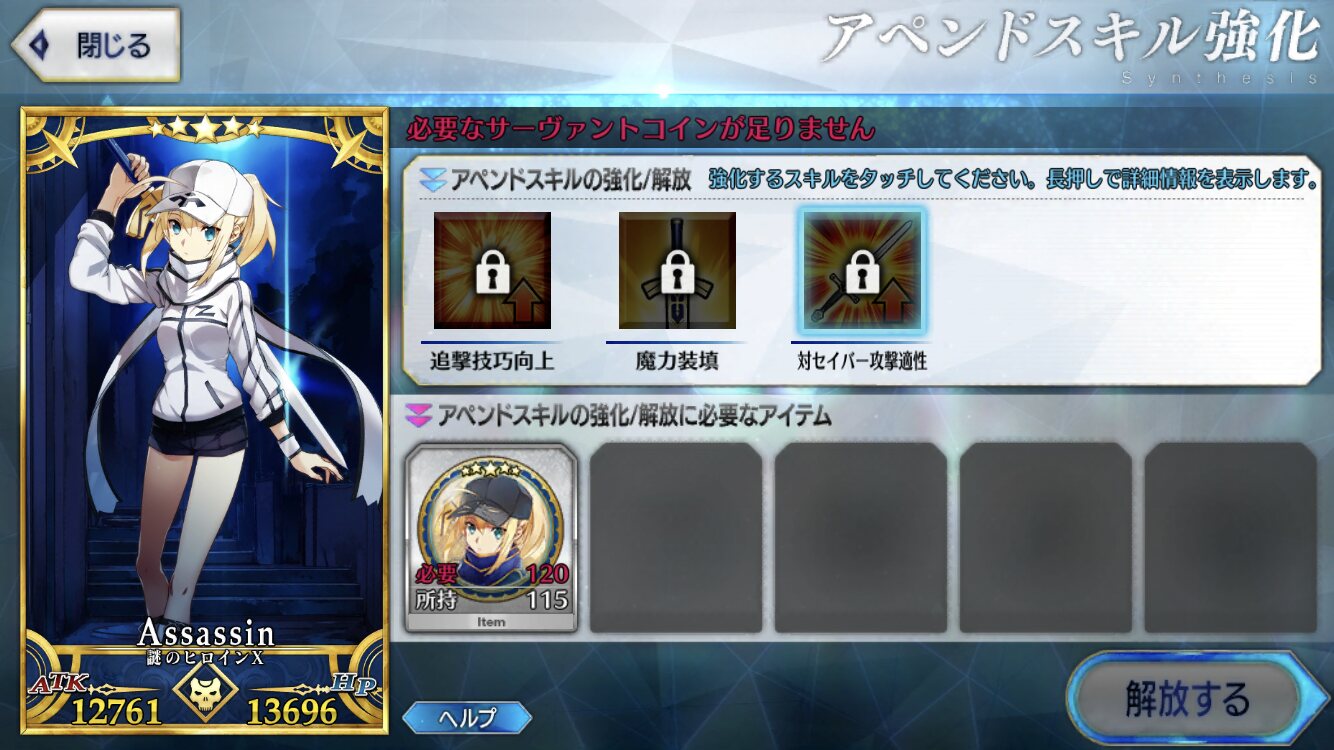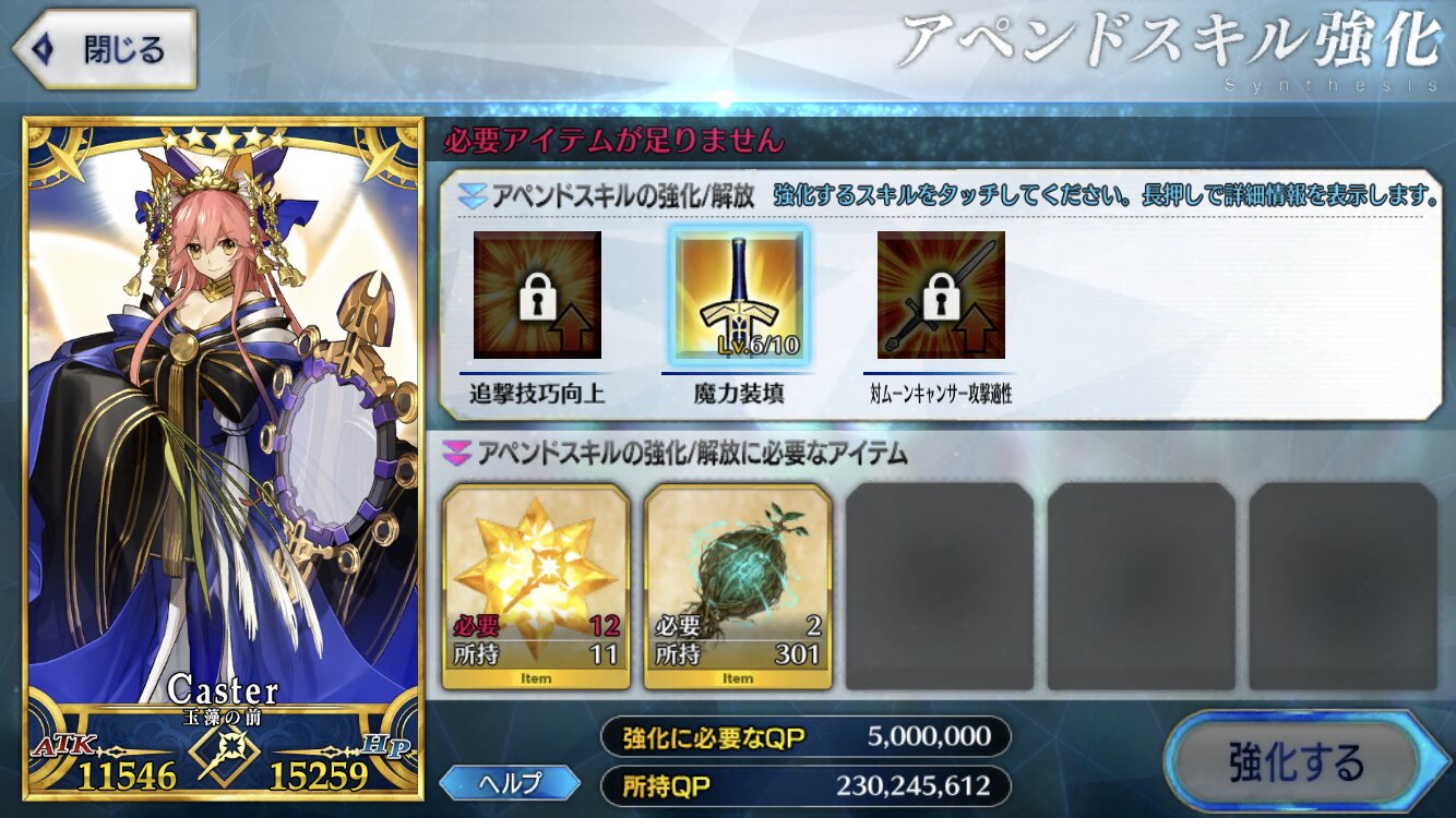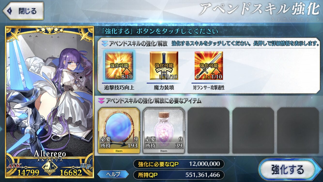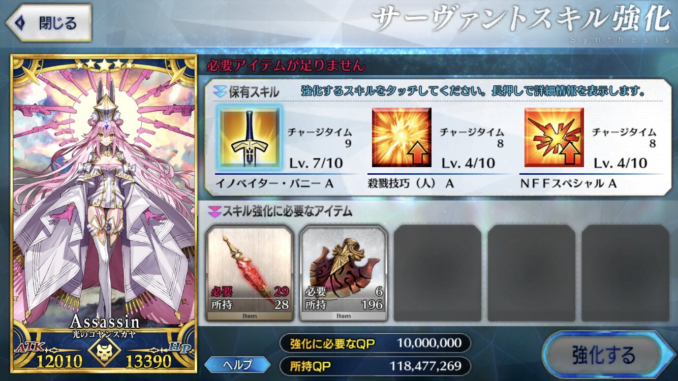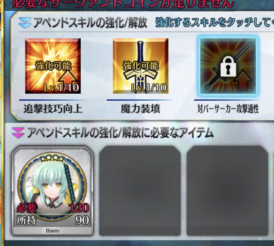 聖杯と素材あってもコインが圧倒的に足りないわ、フレポでコイン稼げないわだし。>>965