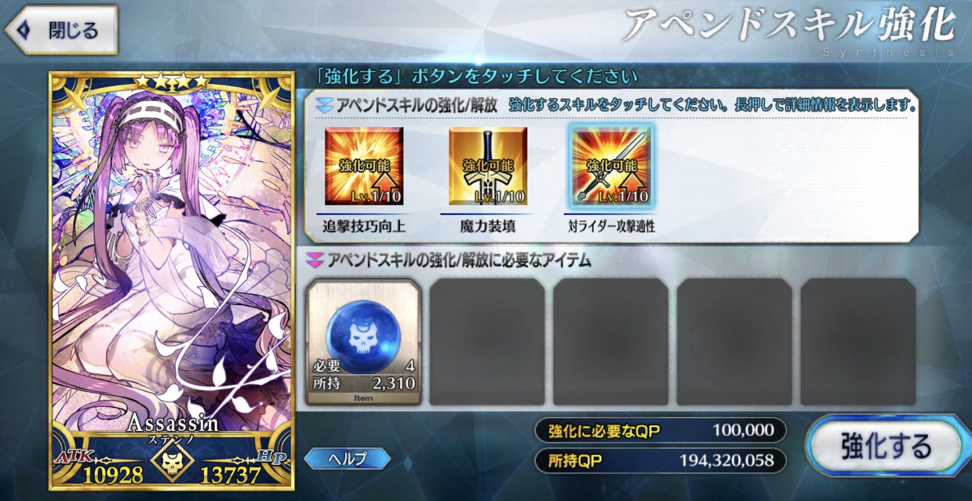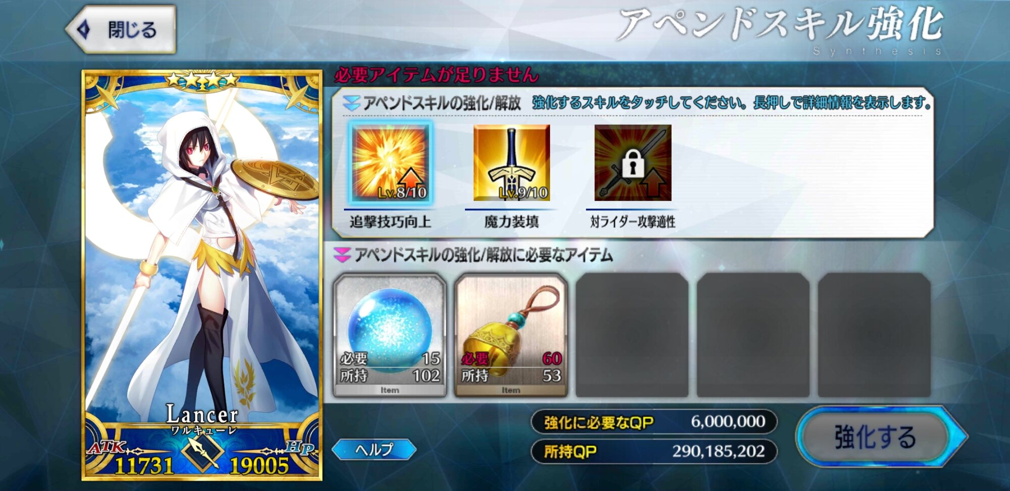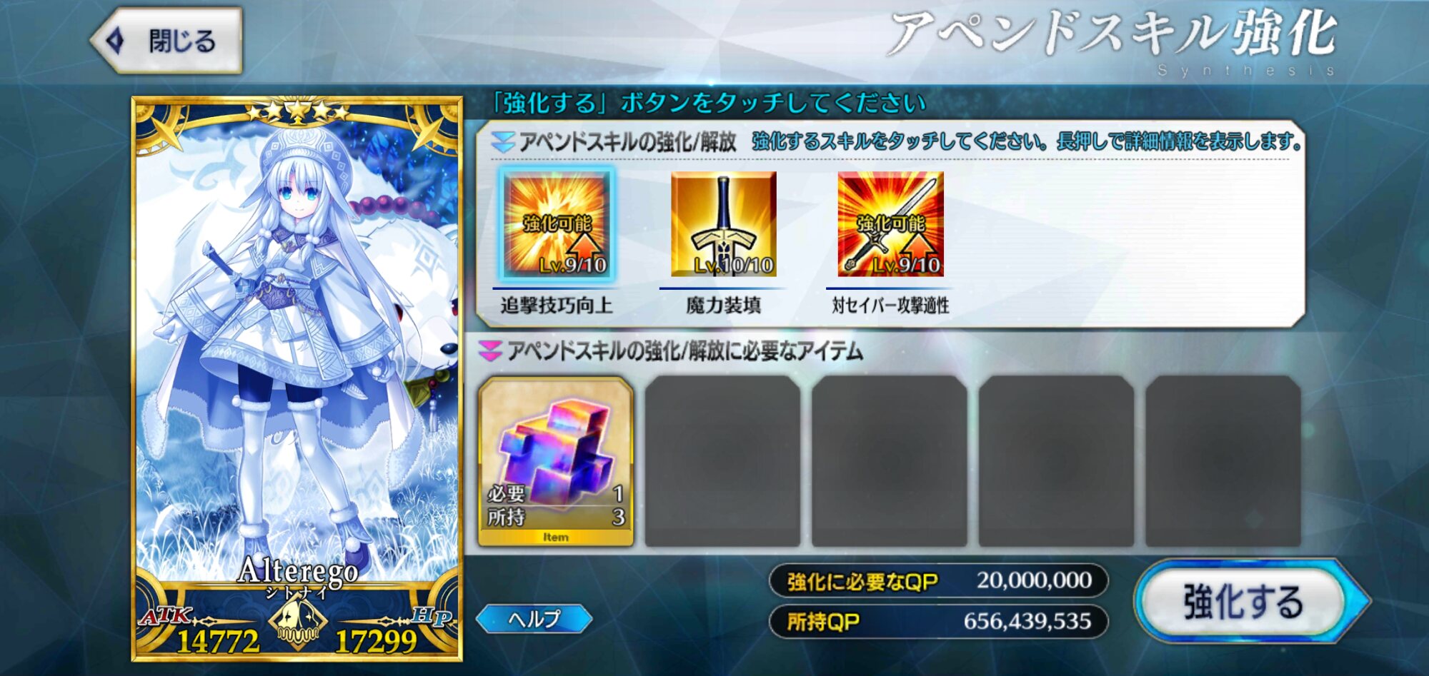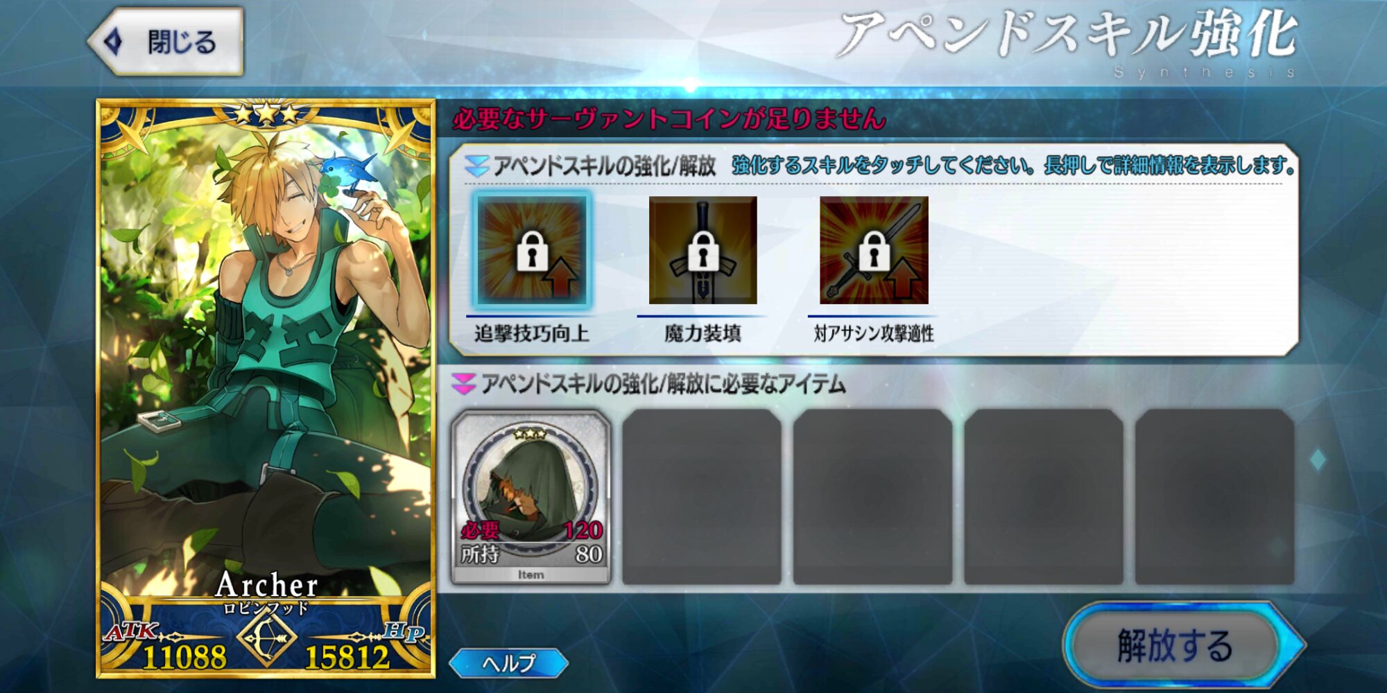 聖杯と素材あってもコインが圧倒的に足りないわ、フレポでコイン稼げないわだし。>>965