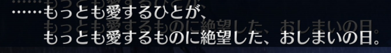 これ、呪いは獣を呼び〜からがよくわかりませんよね。すべては、永遠に落ち続けるらしいですが、どこに落ち続けるんでしょう?大穴なんでしょうか。すべてが落ち続ける→地球崩壊、でしょうかね…?なんにせよ、明日答えがわかるのはとてもドキドキしますね!ぶっ通しでプレイしたい!
