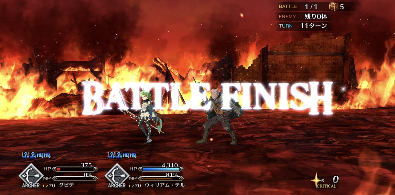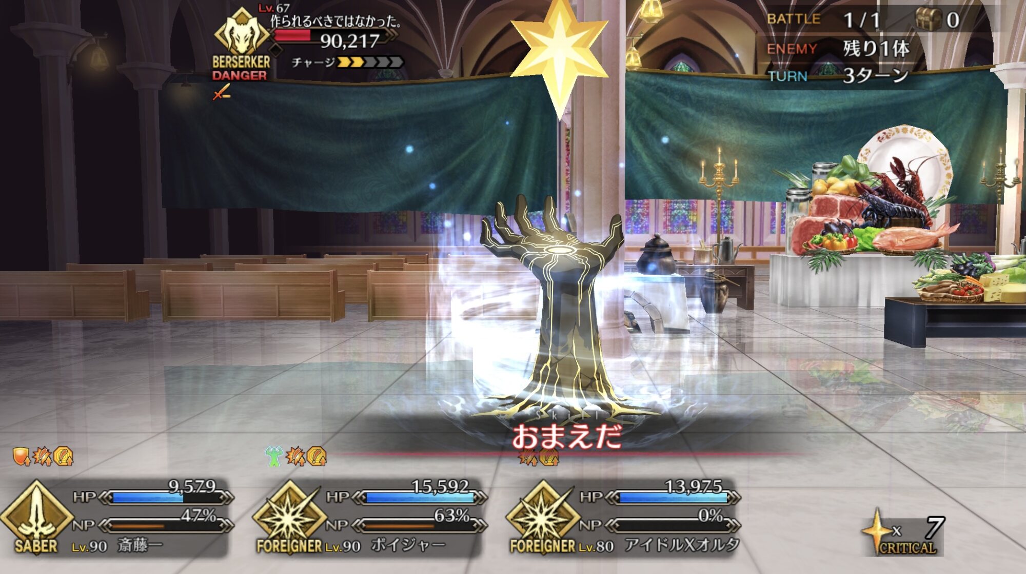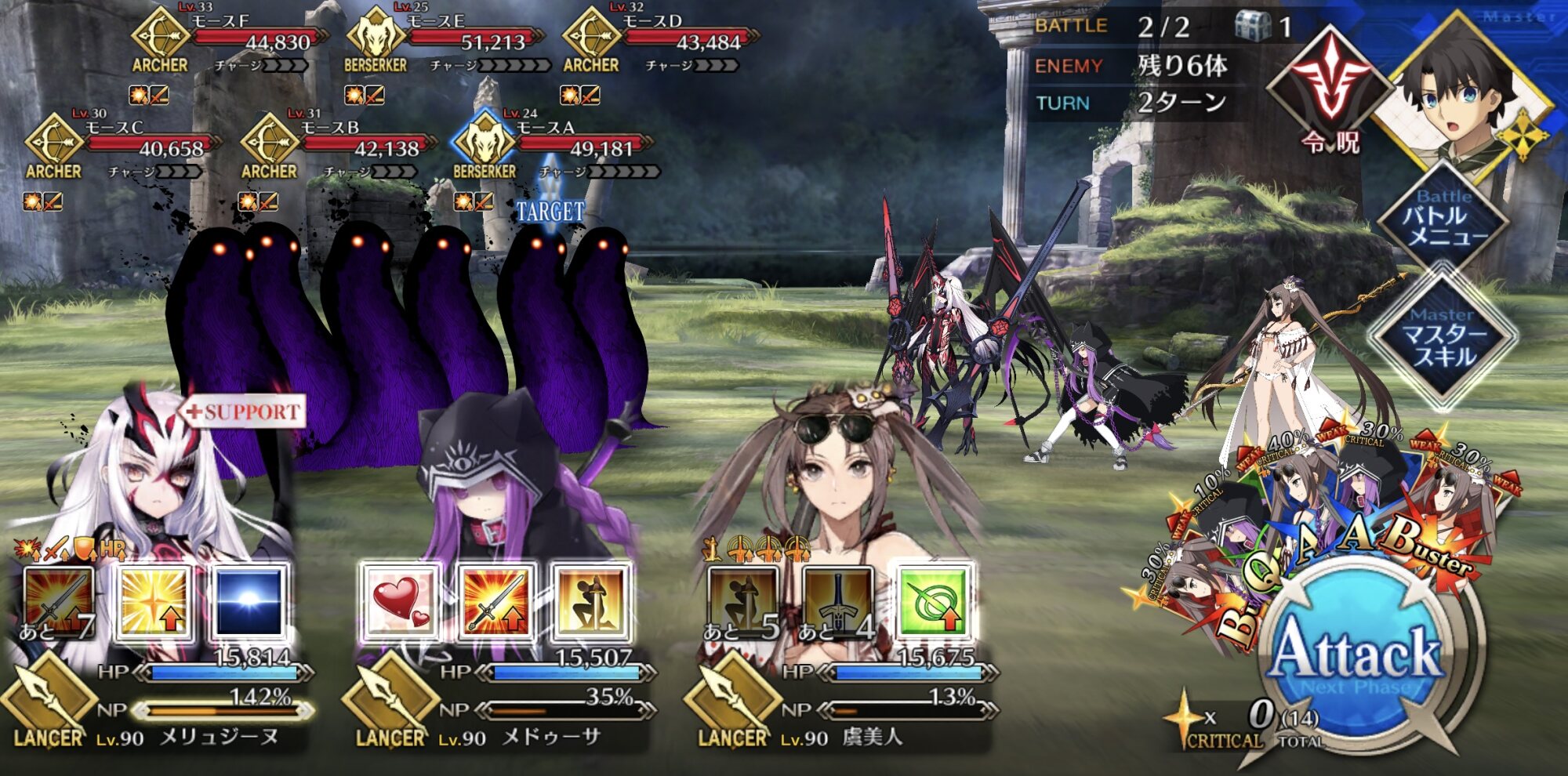 最終ブレイク後は削れるだけ削って後列低レア組とバトンタッチ。強化解除とスタンに注意しながらクリティカルと宝具で削っていく感じですね