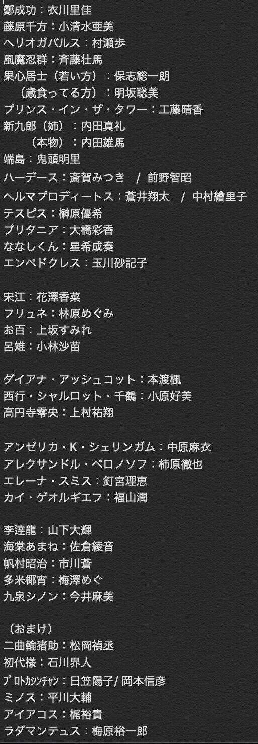 レージュくん、横路に逸れてないで異聞帯の続きを練ろう!(人格分裂)イメージCVは何度か変わる人もいれば固定になっている人もいます。サーヴァントとマスターでわけるとこんな感じです。