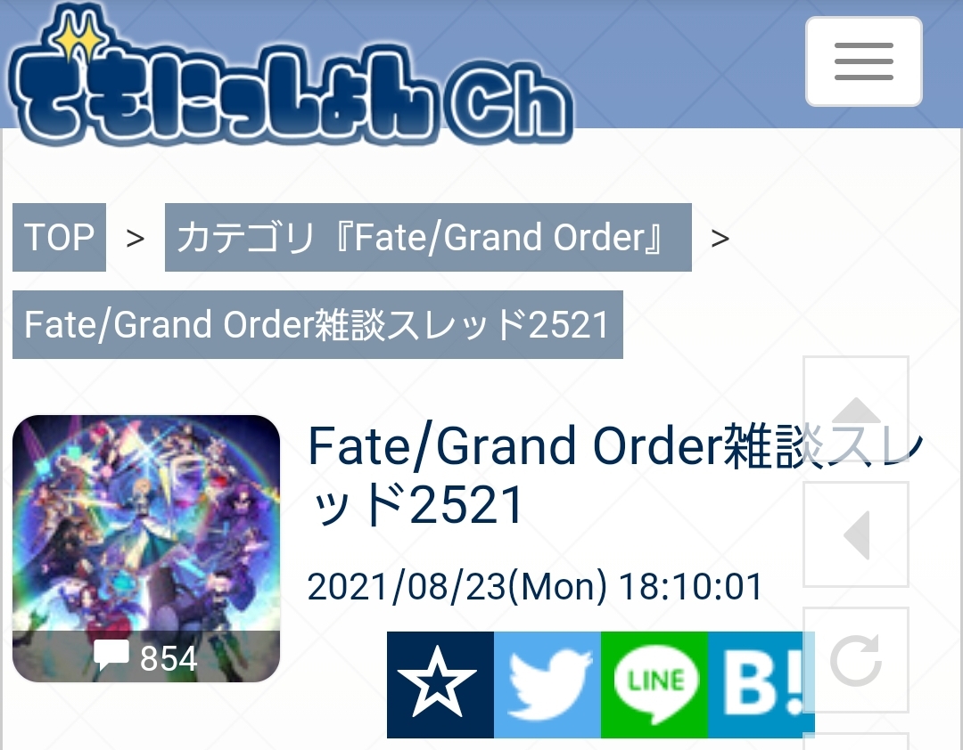 雑談から相談、報告や攻略、盛り上がりたい話題などお気軽に。リーク・解析情報等は禁止です。荒らし・誹謗中傷等は無視し、報告・NGにて対応してください。二次創作画像は転載可能な物に限り、その際必ず引用元を併記してください。R18関連話題、よくてよ無しのガチャ結果、実装から二週間以内のシナリオ及び開催期間中のイベント内容、進行度依存の報酬、最終再臨や霊衣解放の画像や話題は専用スレにてお願いします。