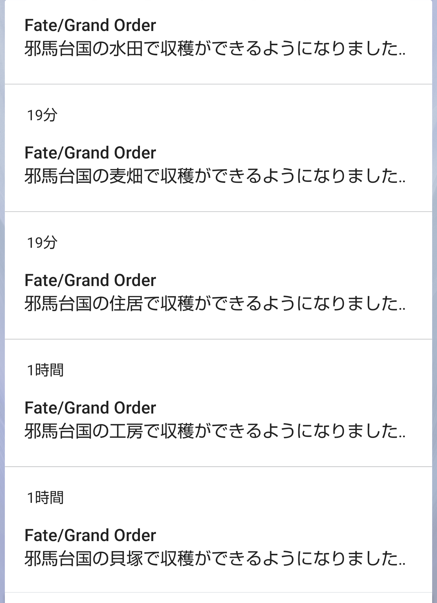時間経過で素材を回収する系のゲームとかのは、APみたいに順繰り増えていって放置しすぎるとMAX、いつでも回収可能って感じだから余裕が持てるけど>>892