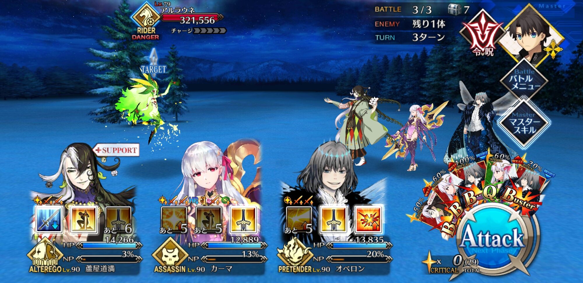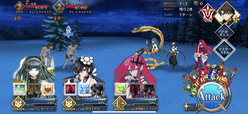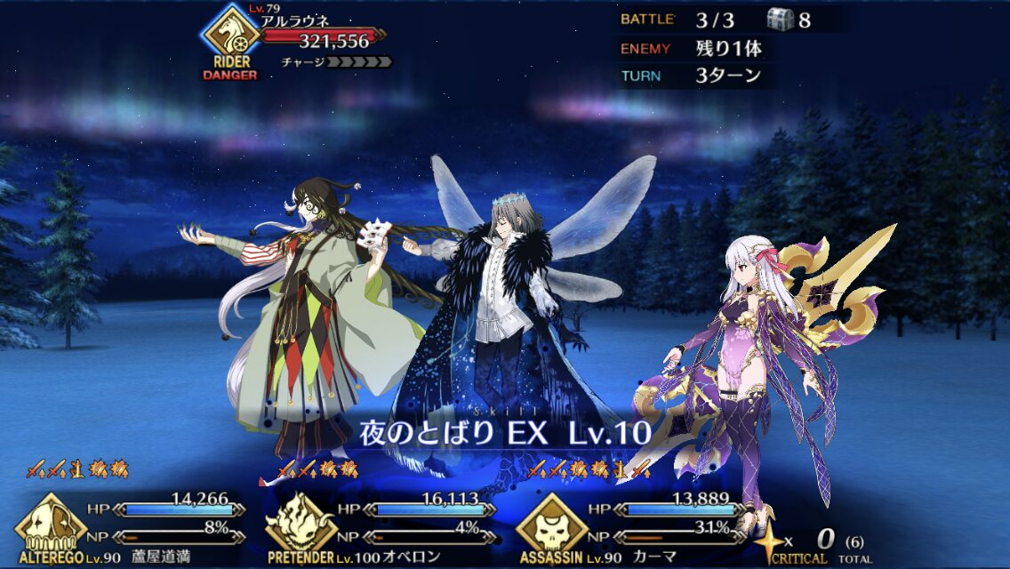 俺はレベル90カーミラさんをコヤンスカヤで挟んでやるとマスタースキルも組み合わせて40万ダメージでアルラウネをワンパンしてる。