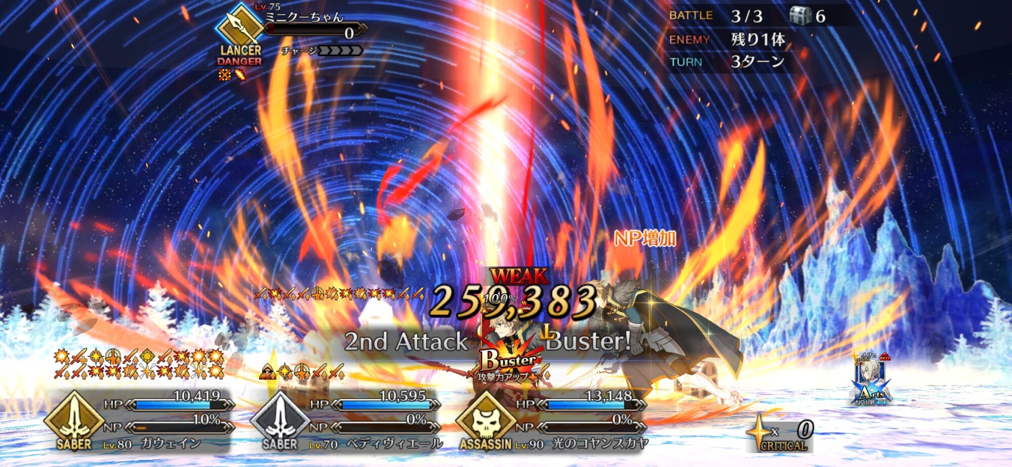 それでも知恵の神かおのれは…ってずっと思ってたし、ノーコンクリアしたけど正直恩恵としては微妙すぎたなぁ…。まぁタイミングよく弱体解除やHP回復しても無慈悲なバフ盛り全体クリティカル攻撃で運悪いと一瞬で三騎壊滅なんじゃが……