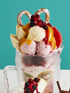 今日のパフェはめちゃくちゃキラキラしてるメロンに色がきれいなミカン、飾りに一口サイズのクッキーとかが乗ってて、あと引くほど大きなパイナップルまで刺さっててさ。アイスクリームはバニラとストロベリーの真ん丸なのが二つ、それらの頂点にあるクリームの上には真っ赤なさくらんぼまで乗っててまさに王道ってかんじのパフェだったんだ。