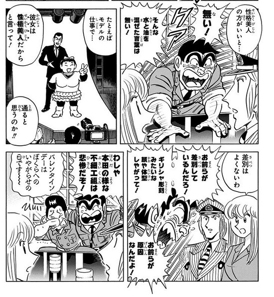 両津・本田「は? 美男美女のお前らが言うな! イケメンのほうが得なのはバレンタインの格差でも見ればわかるだろ!」
