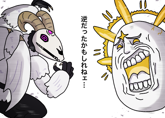下の体か羽っぽいのもこうして見ると一本角の頭のように感じるポイント終わったけどアイテム全交換は林檎食べなきゃ無理そうだ