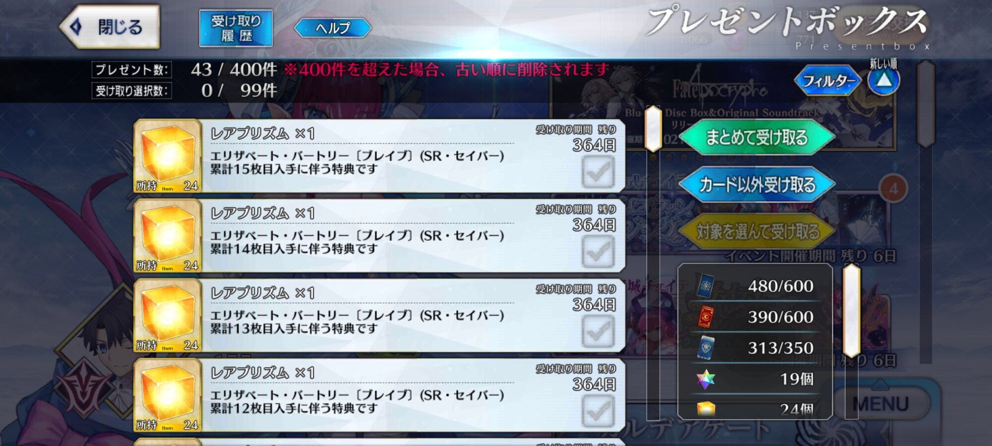 あとどんくらい残ってるのか知らないけど、そうやって『優先順位の末端の』交換素材集めるよりかは素直にフリクエとか残ってる幕間とか消化した方がいいと思うよ。アイテム交換終わった(メカエリちゃんの片方受け取れないので毒リンゴのやつが残っているけど)終わったーと思ったら伝承受け取れてなかった件