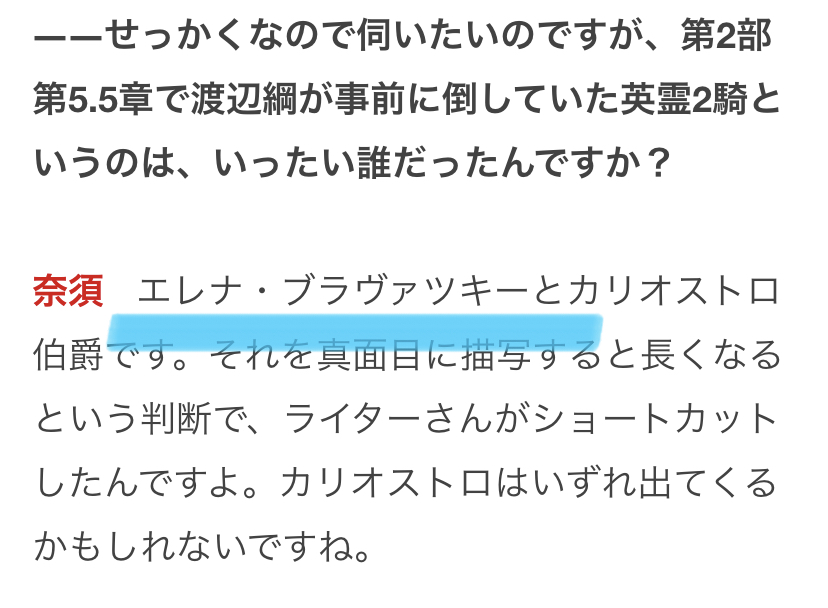 そして完全版インタビューにて頼光さん関連でもう一悶着ある可能性が示唆されていますが、これが5.5章クリア条件のイベントについてなら、かつて退場したカリオストロ伯爵とエレナさんにも言及があるのではないかと楽しみですね!!