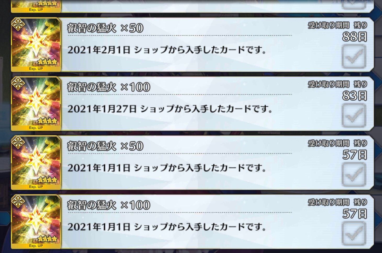 スキルマ、宝具lv、金フォウ、獣の足跡、コマンドカード、アペンドスキル、lv120までの聖杯と種火。