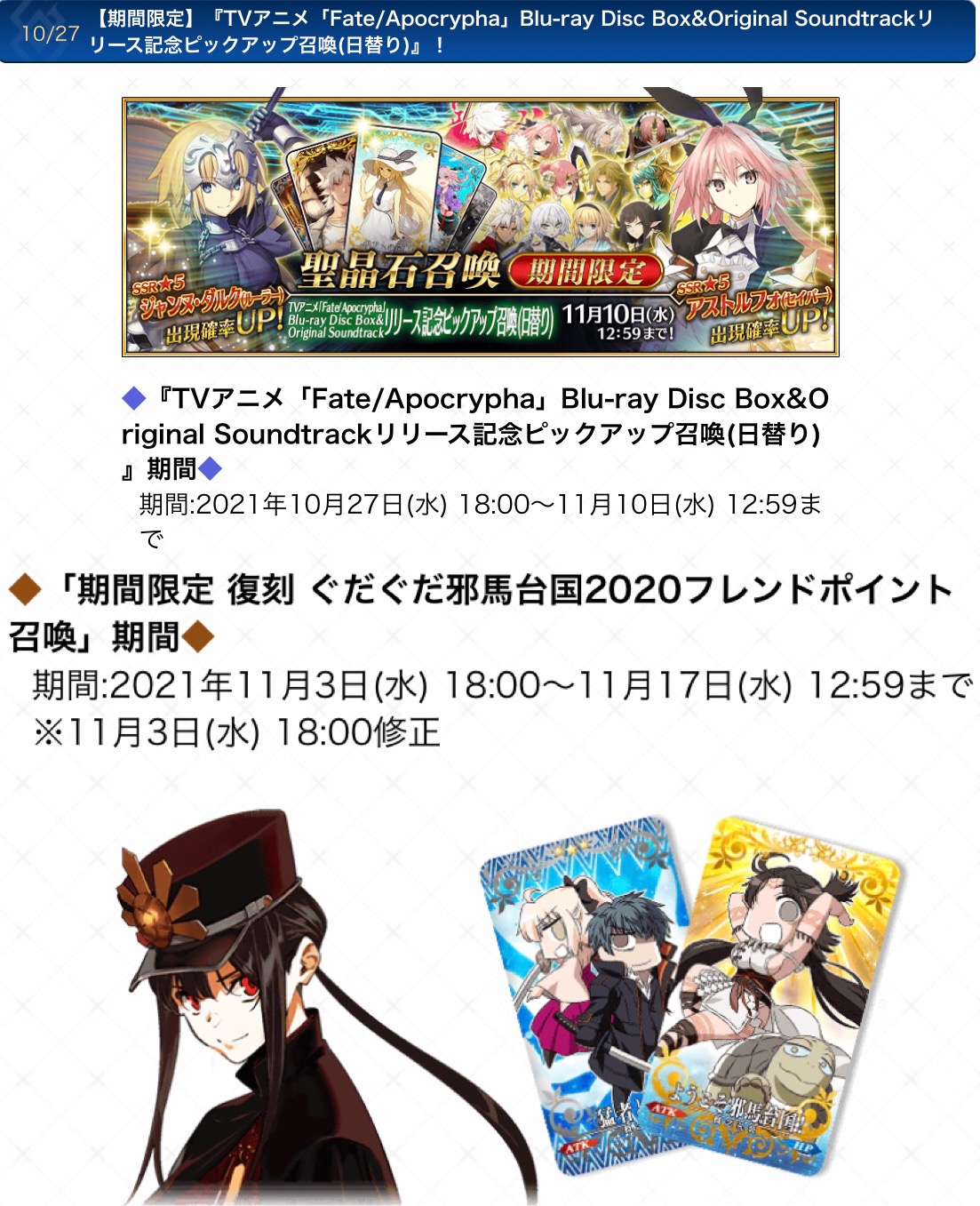 「ぐだぐだ邪馬台国復刻ライト版」と「卑弥呼&沖田総司&土方歳三&斎藤一PU」と「無料フレンドポイント召喚二倍」終了(11月17日)まであと7日です!