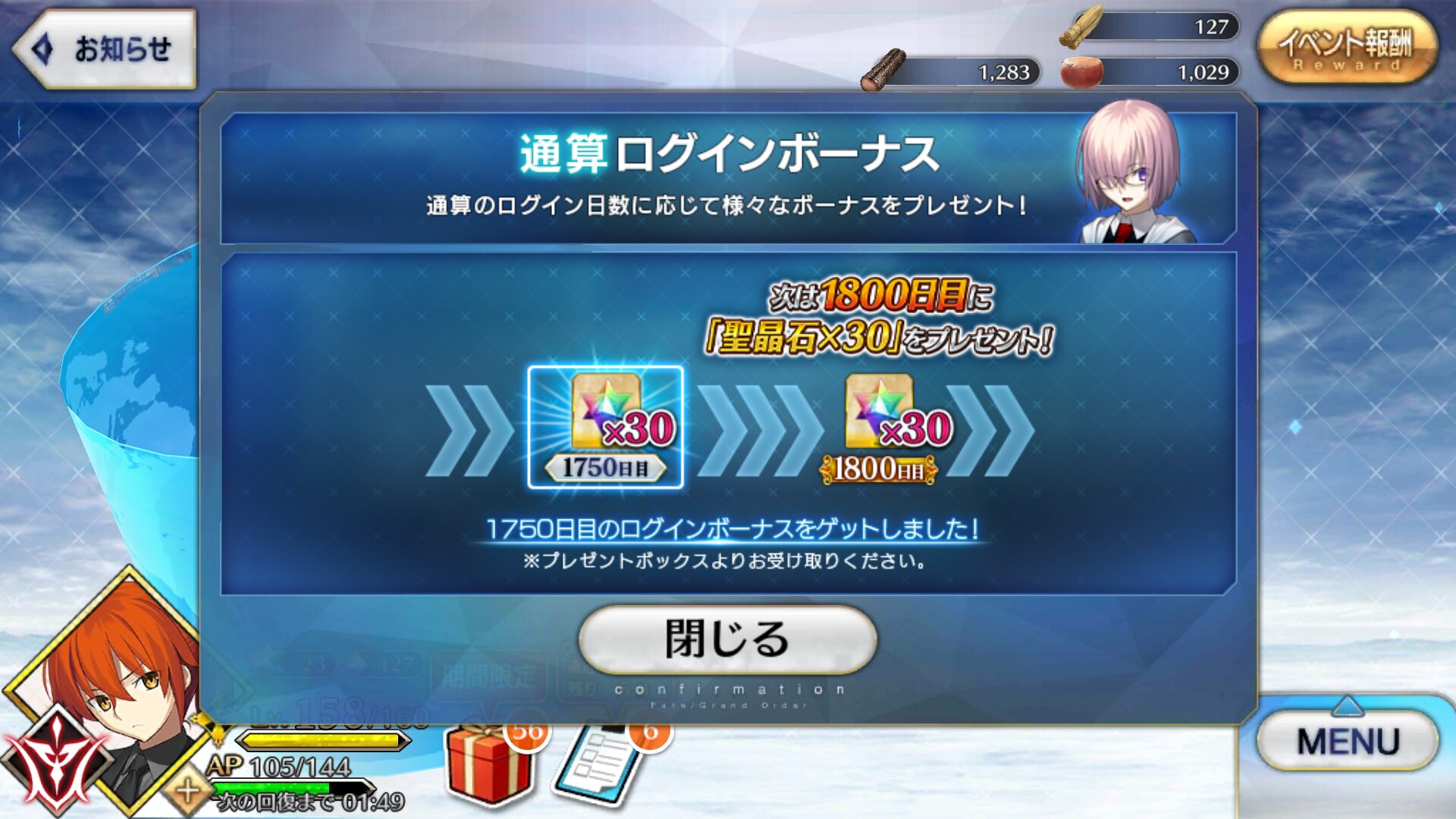 メインクエスト5.5章までのAP1/4終了(12月2日)まであと22日です!