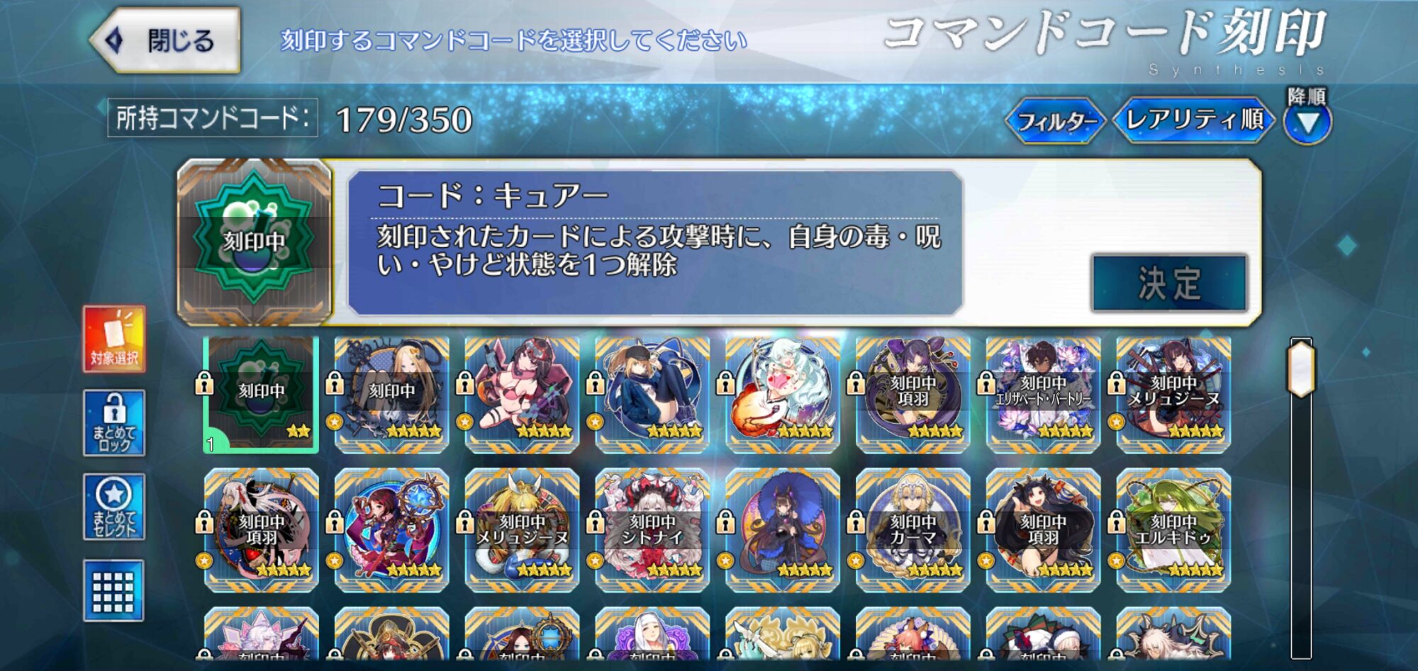 呪い無効、弱体無効、スキル封印耐性、宝具封印耐性、あと敵のHP回復量ダウンつけとけばOKかな?>>985