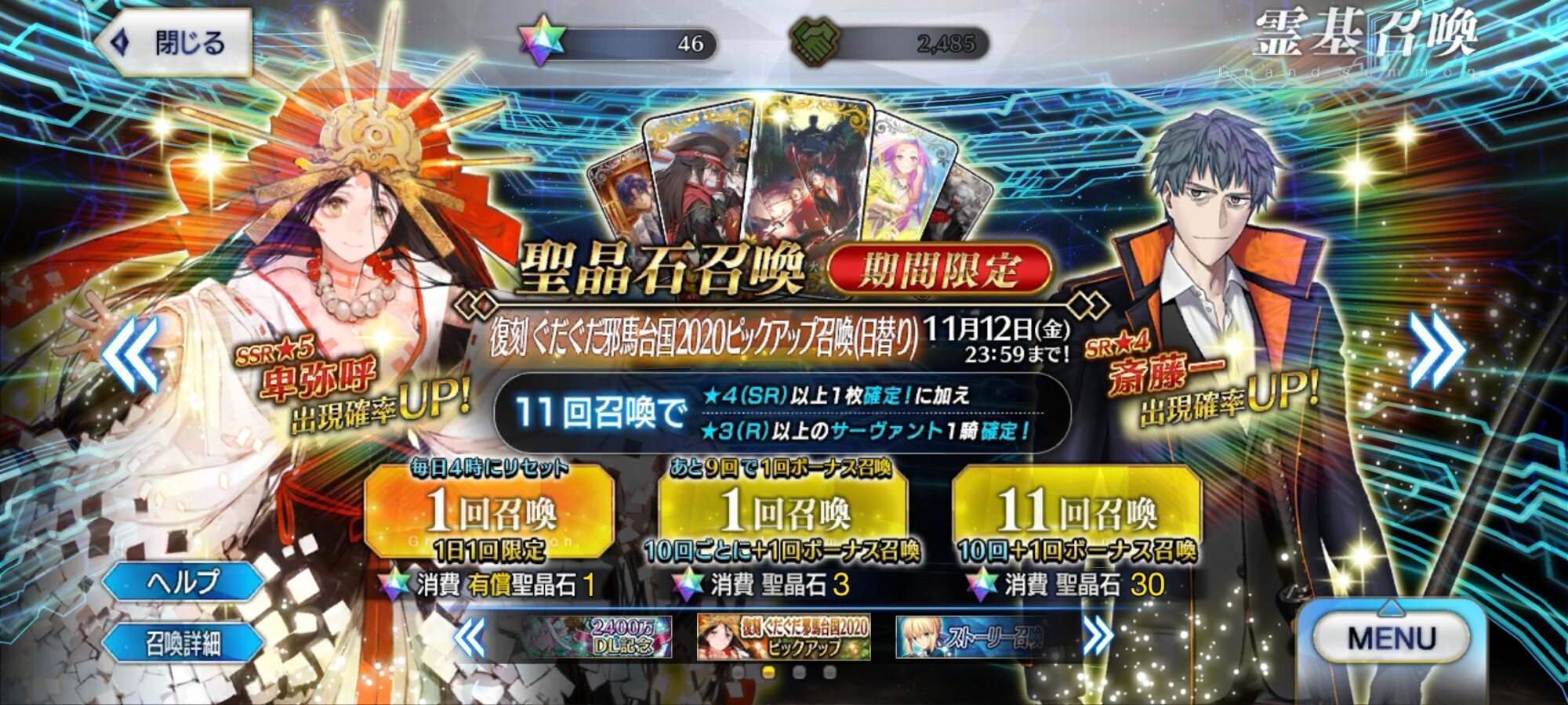 「ぐだぐだ邪馬台国復刻ライト版」と「卑弥呼&沖田総司&土方歳三&斎藤一PU」と「無料フレンドポイント召喚二倍」終了(11月17日)まであと6日です!