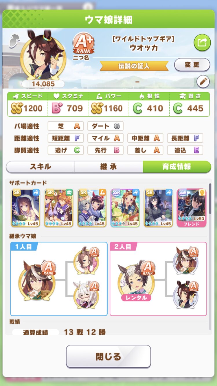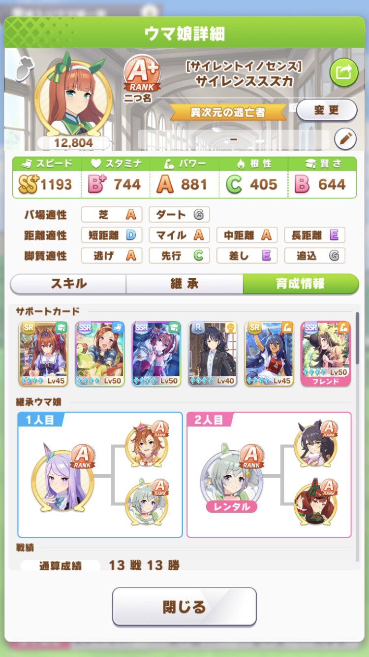 ウオッカですまんが以前のマイルチャンミの時のウオッカがこんな感じ、あんま覚えてないけど持ってるサポカ的に賢さ盛るよりもスピパワちゃんとしようとしたんだと思う、フクキタルは多分スキルPt目当てかな?>>966