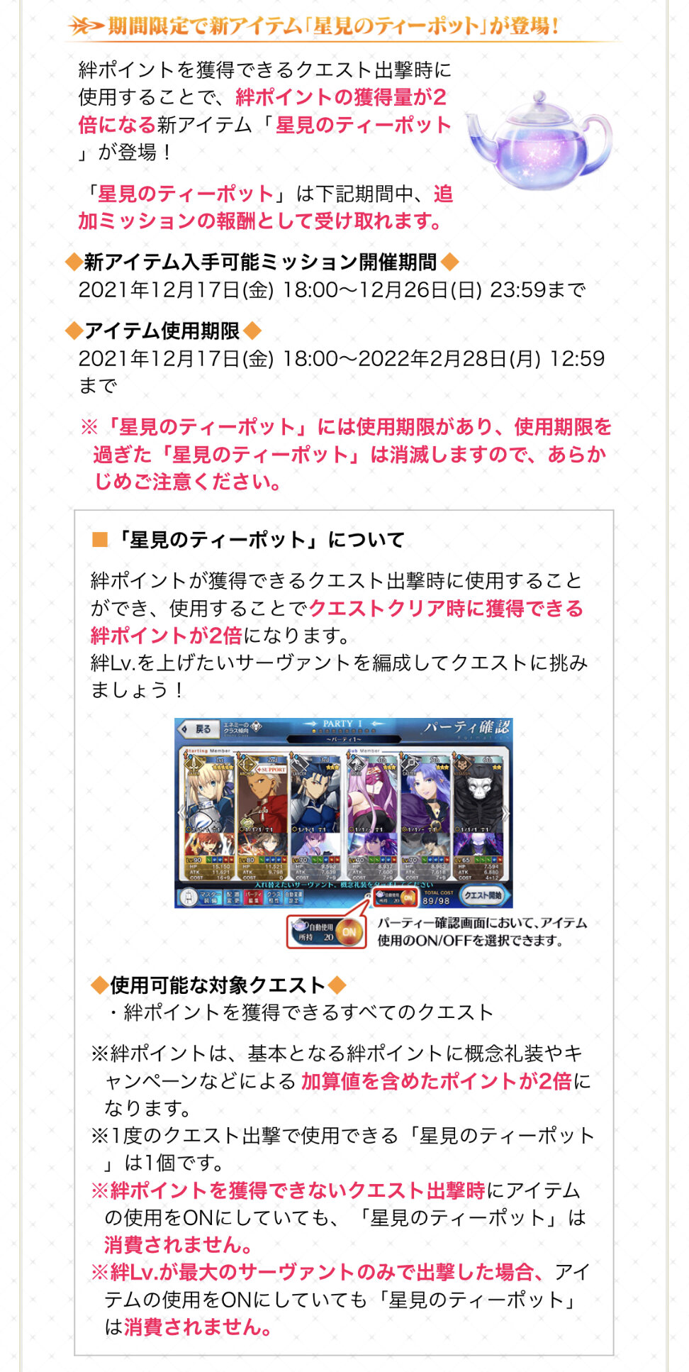以下の条件を満たしたマスターが参加可能 ・第2部 第6章「Lostbelt No.6 妖精円卓領域 アヴァロン・ル・フェ 星の生まれる刻」をクリア